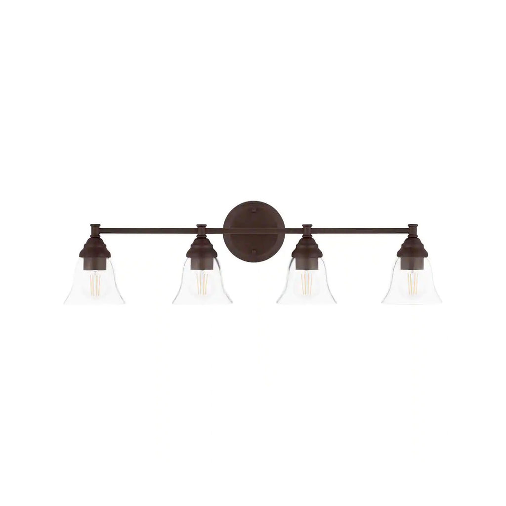 La lámpara de tocador de 4 luces en bronce frotado al aceite con vidrio claro de Hampton Bay es una adición impresionante a cualquier baño. Esta lámpara de tocador presenta un diseño de transición que combina elementos clásicos y modernos, lo que la hace tanto funcional como decorativa. El acabado en bronce frotado al aceite y las pantallas de vidrio claro crean un aspecto sofisticado que complementa una variedad de estilos de decoración. El accesorio está diseñado para una fácil instalación con el hardware de montaje incluido y se puede montar con las pantallas hacia arriba o hacia abajo. Requiere cuatro bombillas E26 de 60 vatios (no incluidas) y proporciona una iluminación adecuada para tu espacio de tocador o baño. La construcción de metal duradero garantiza un rendimiento duradero, mientras que el diseño elegante añade un toque de encanto a tu baño. Ya sea que te estés preparando para el día o relajándote por la noche, la lámpara de tocador Marsden ofrece estilo y funcionalidad. Mejora la iluminación de tu baño con la lámpara de tocador de 4 luces en bronce frotado al aceite Marsden y disfruta de la combinación perfecta de forma y función.Características