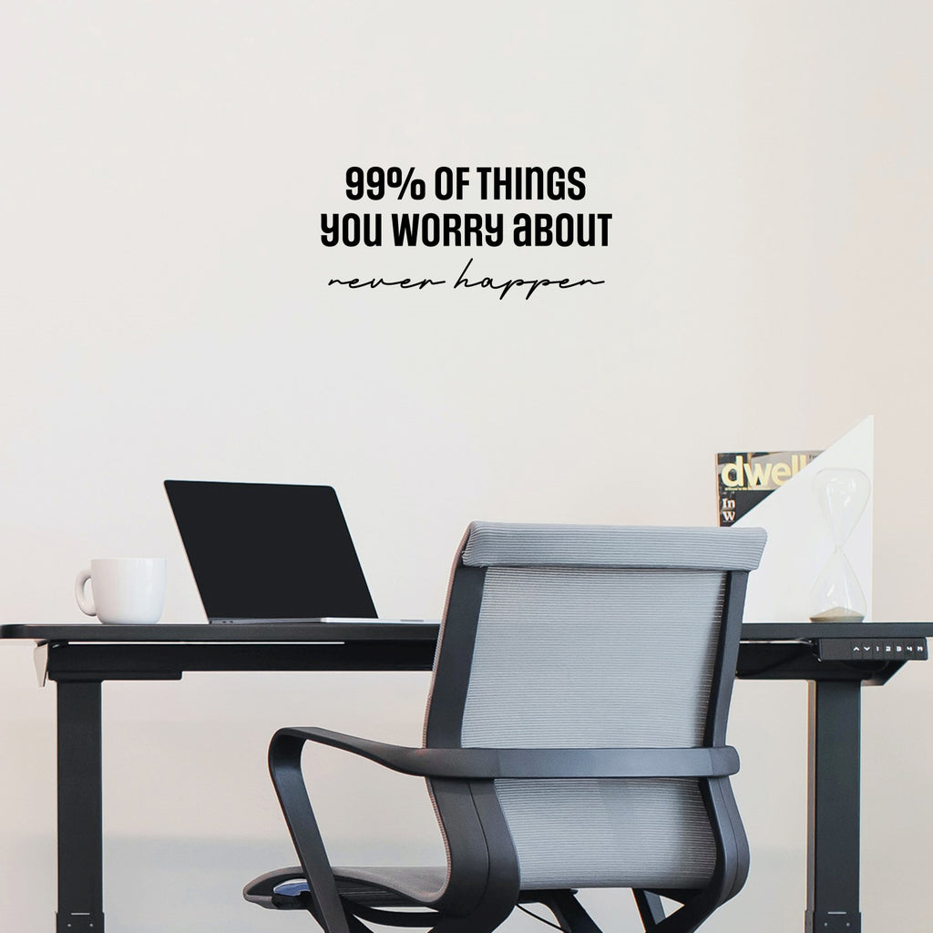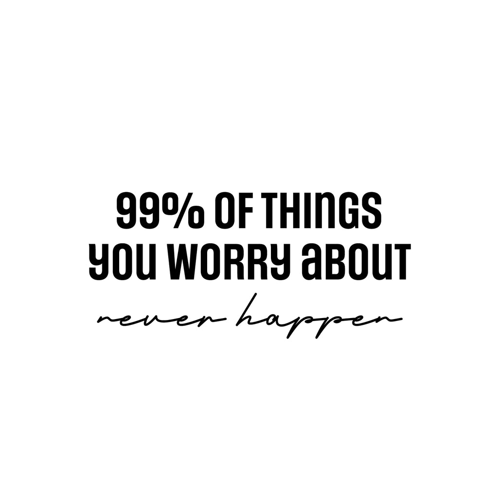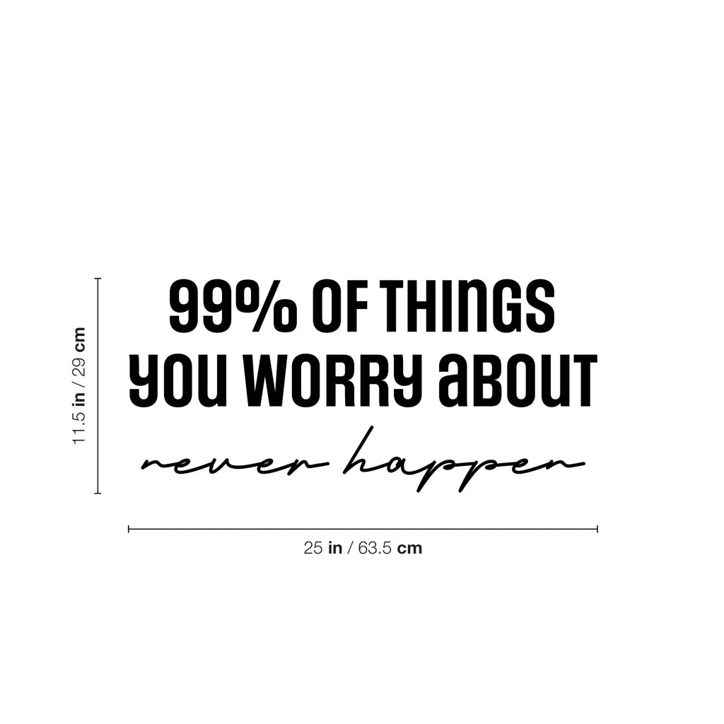 This decal quote "99% Of The Things You Worry About Never Happen"; is the perfect touch for your home. Use it for your dorm room or anywhere you want to bring some extra decoration. It's a vinyl sticker that is easy to put on any smooth and dry surface. Our modern designs don't just brighten up the room; but brighten up the day. Using top of the line vinyl across all of our production allows us to be the leaders in quality and design.