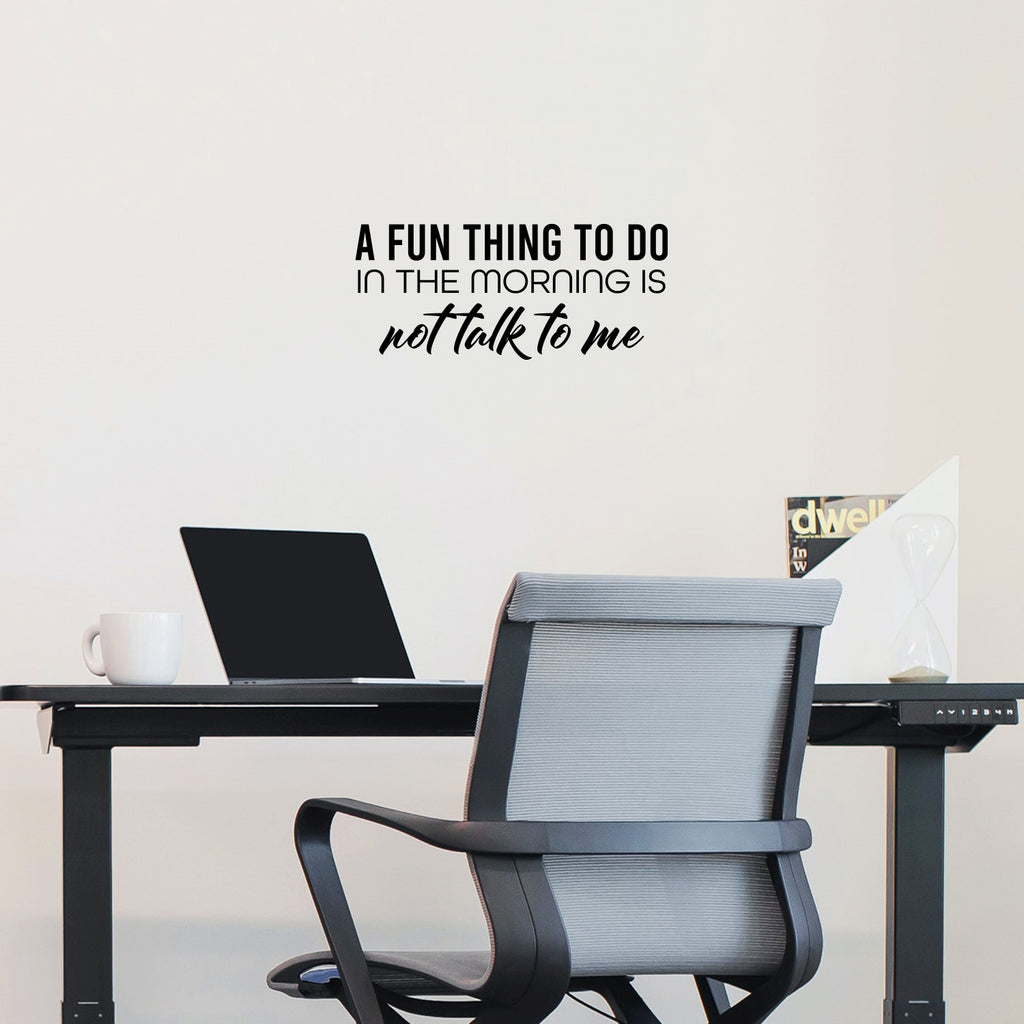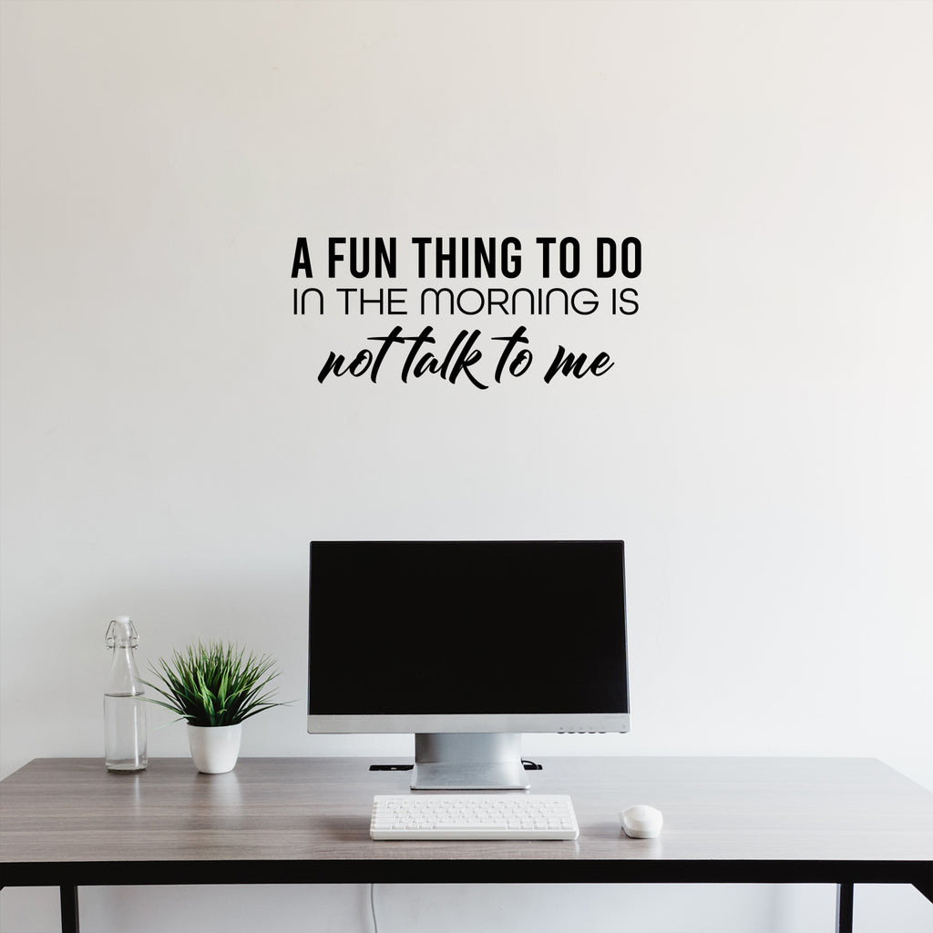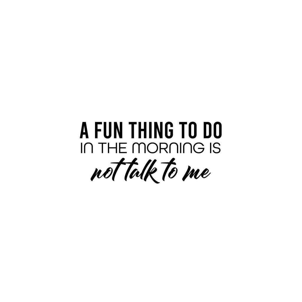 This funny & sarcastic decal quote "A Fun Thing To Do In The Morning Is Not Talk To Me"; is the perfect touch for your home or office. Use it for your store; coffee shop or anywhere you want to bring some extra funny decoration. It's a vinyl sticker that is easy to put on any smooth and dry surface. Our modern designs don't just brighten up the room; but brighten up the day. Using top of the line vinyl across all of our production allows us to be the leaders in quality and design.