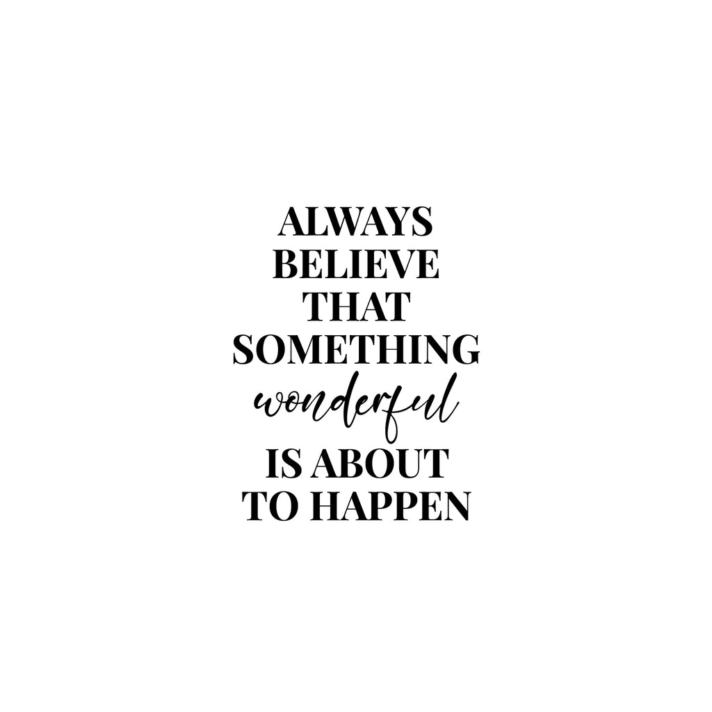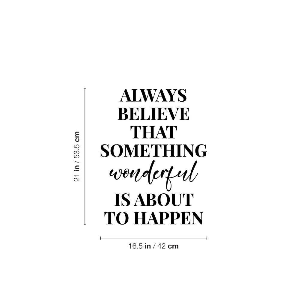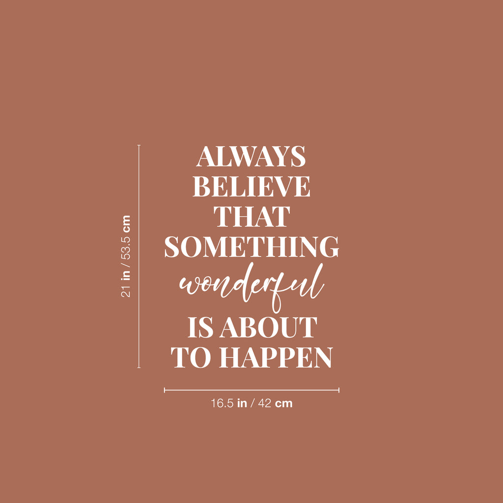 This awesome positive decal quote "Always Believe That Something Wonderful is About Happen"; is the perfect touch for your home or office. Use it for your bedroom; playroom; living room or anywhere you want to bring some extra positive decoration. It's a vinyl sticker that is easy to put on any smooth and dry surface. Our modern designs don't just brighten up the room; but brighten up the day. Using top of the line vinyl across all of our production allows us to be the leaders in quality and design.