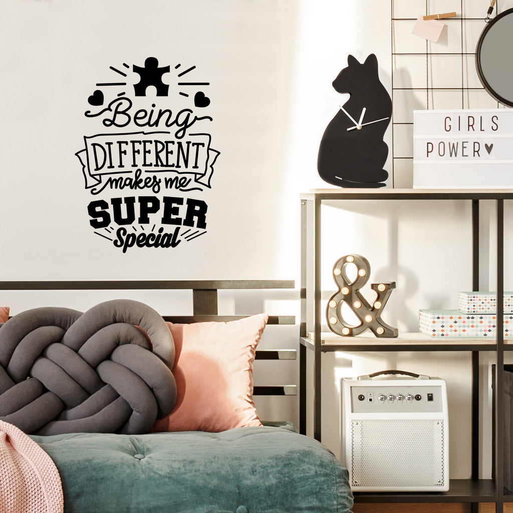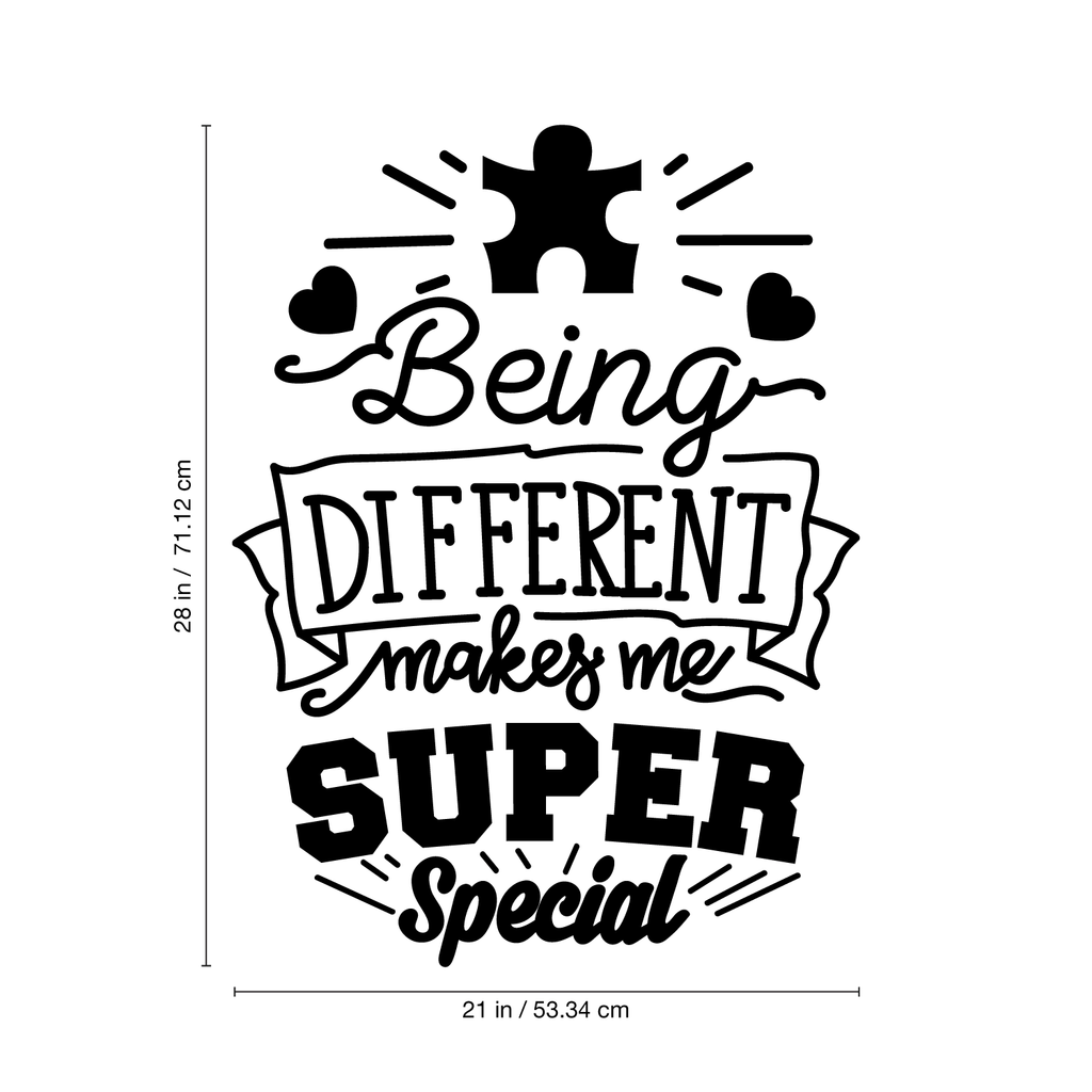 This awesome positive decal quote "Being Different Makes Me Super Special"; is the perfect touch for your home or work. Use it for your dorm room; living room or anywhere you want to bring some extra optimistic decoration. It's a vinyl sticker that is easy to put on any smooth and dry surface. Our modern designs don't just brighten up the room; but brighten up the day. Using top of the line vinyl across all of our production allows us to be the leaders in quality and design.