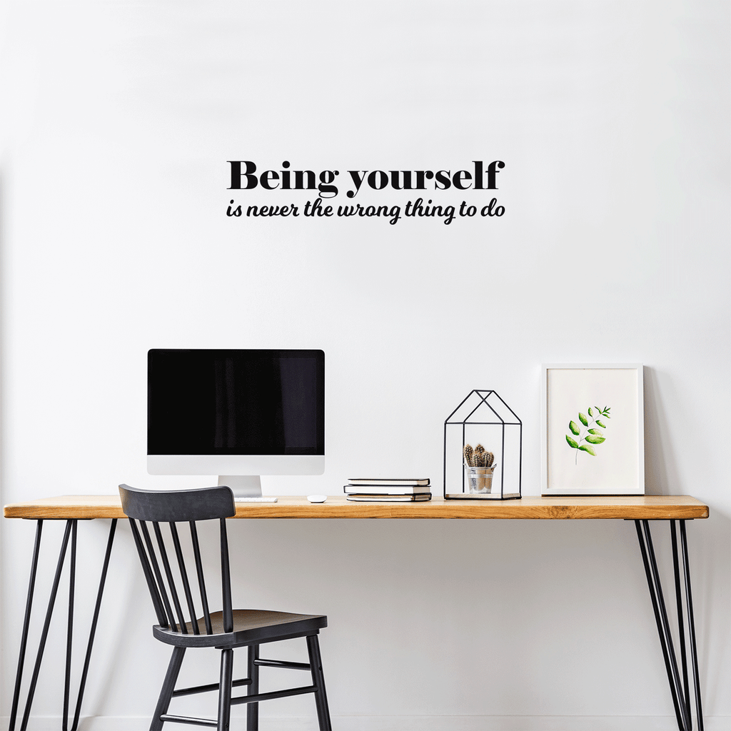 This awesome motivational decal quote "Being Yourself Is Never The Wrong Thing To Do"; is the perfect touch for your home. Use it for your bedroom; living room; office or anywhere you want to bring some extra decoration. It's a vinyl sticker that is easy to put on any smooth and dry surface. Our modern designs don't just brighten up the room; but brighten up the day. Using top of the line vinyl across all of our production allows us to be the leaders in quality and design.