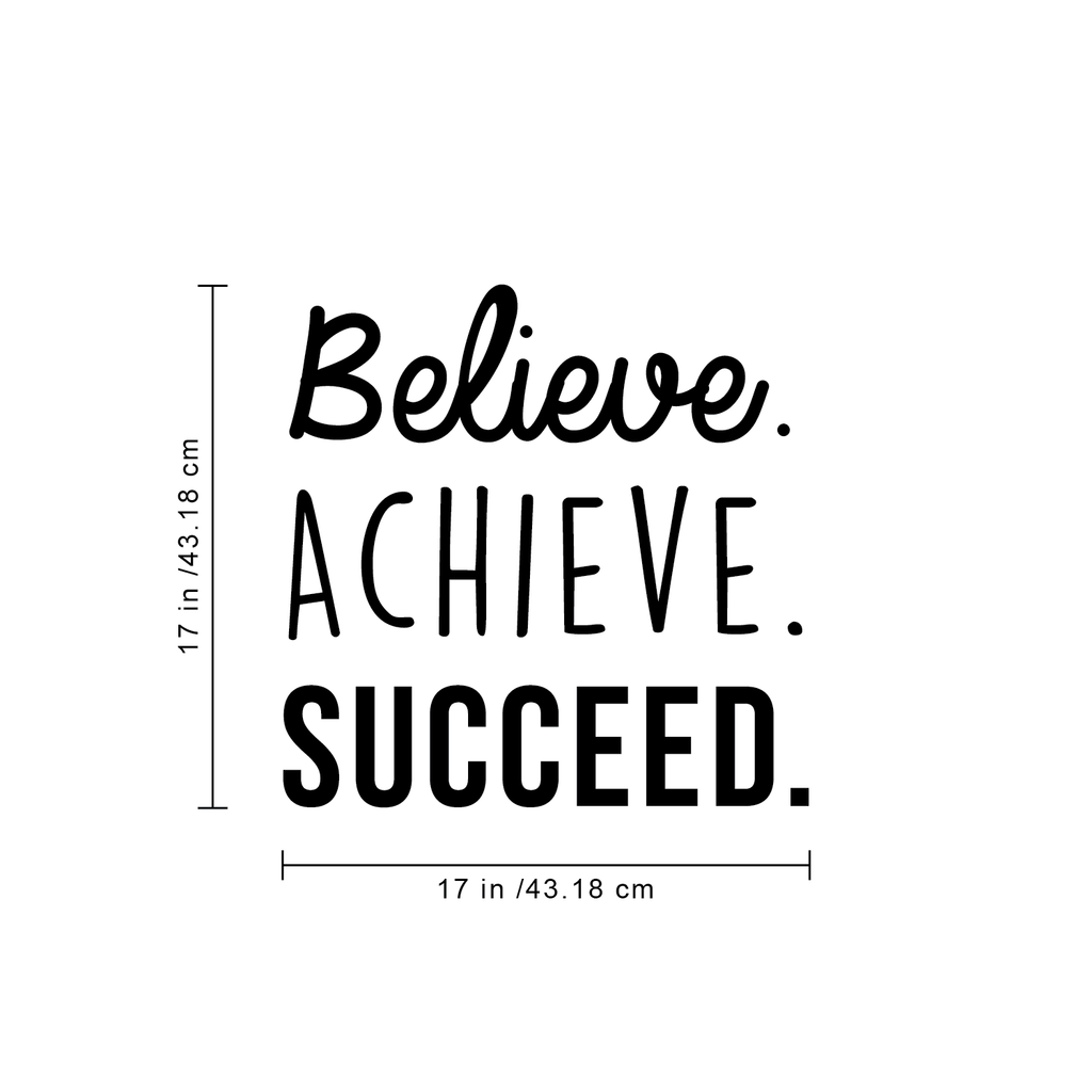This awesome motivational decal quote "Believe Achieve Succeed"; is the perfect touch for your home. Use it for your bedroom; office or anywhere you want to bring some extra positive decoration. It's a vinyl sticker that is easy to put on any smooth and dry surface. Our modern designs don't just brighten up the room; but brighten up the day. Using top of the line vinyl across all of our production allows us to be the leaders in quality and design.