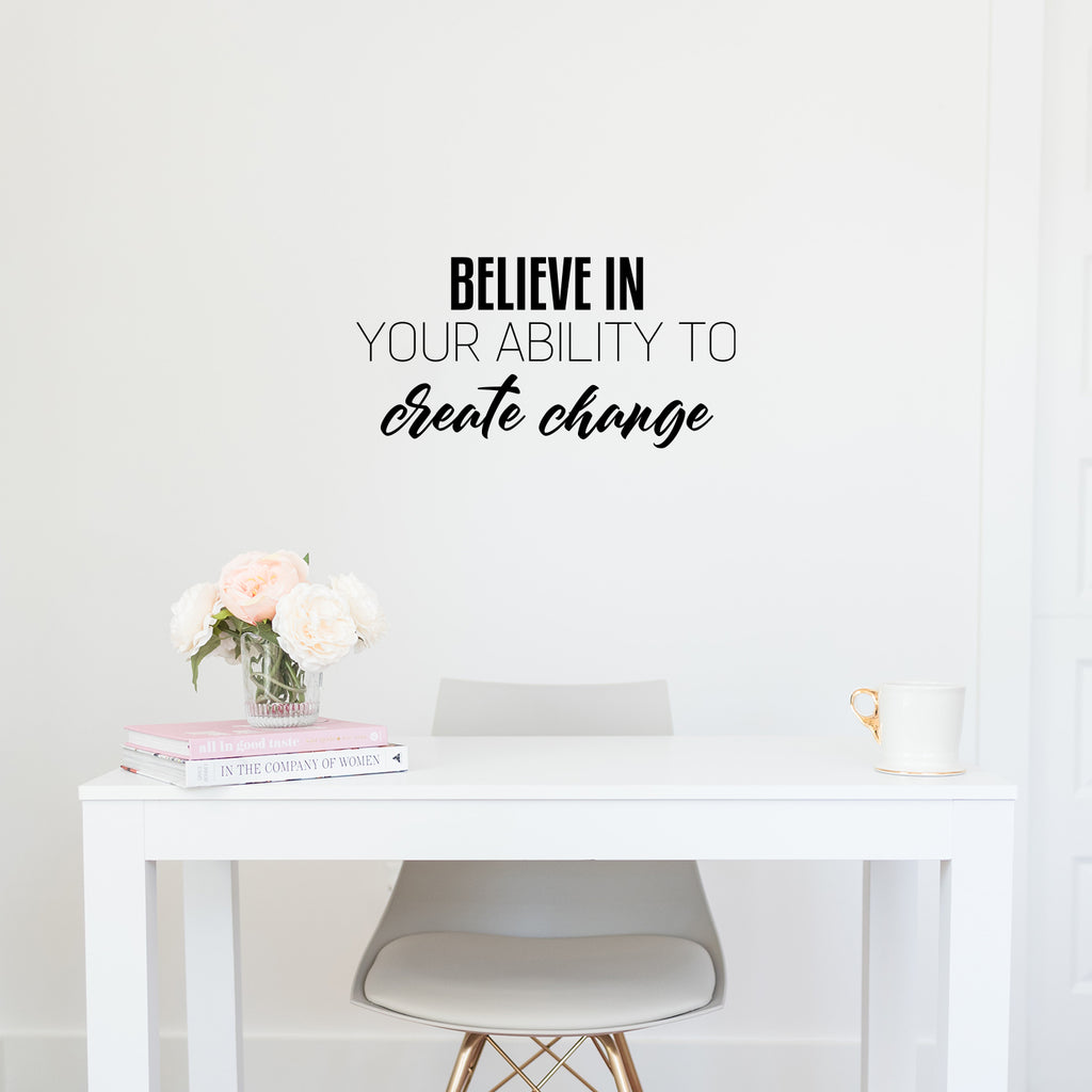 This awesome positive decal quote "Believe In Your Ability To Create Change"; is the perfect touch for your school. Use it for your classroom; playroom; office or anywhere you want to bring some extra inspiring decoration. It's a vinyl sticker that is easy to put on any smooth and dry surface. Our modern designs don't just brighten up the room; but brighten up the day. Using top of the line vinyl across all of our production allows us to be the leaders in quality and design.