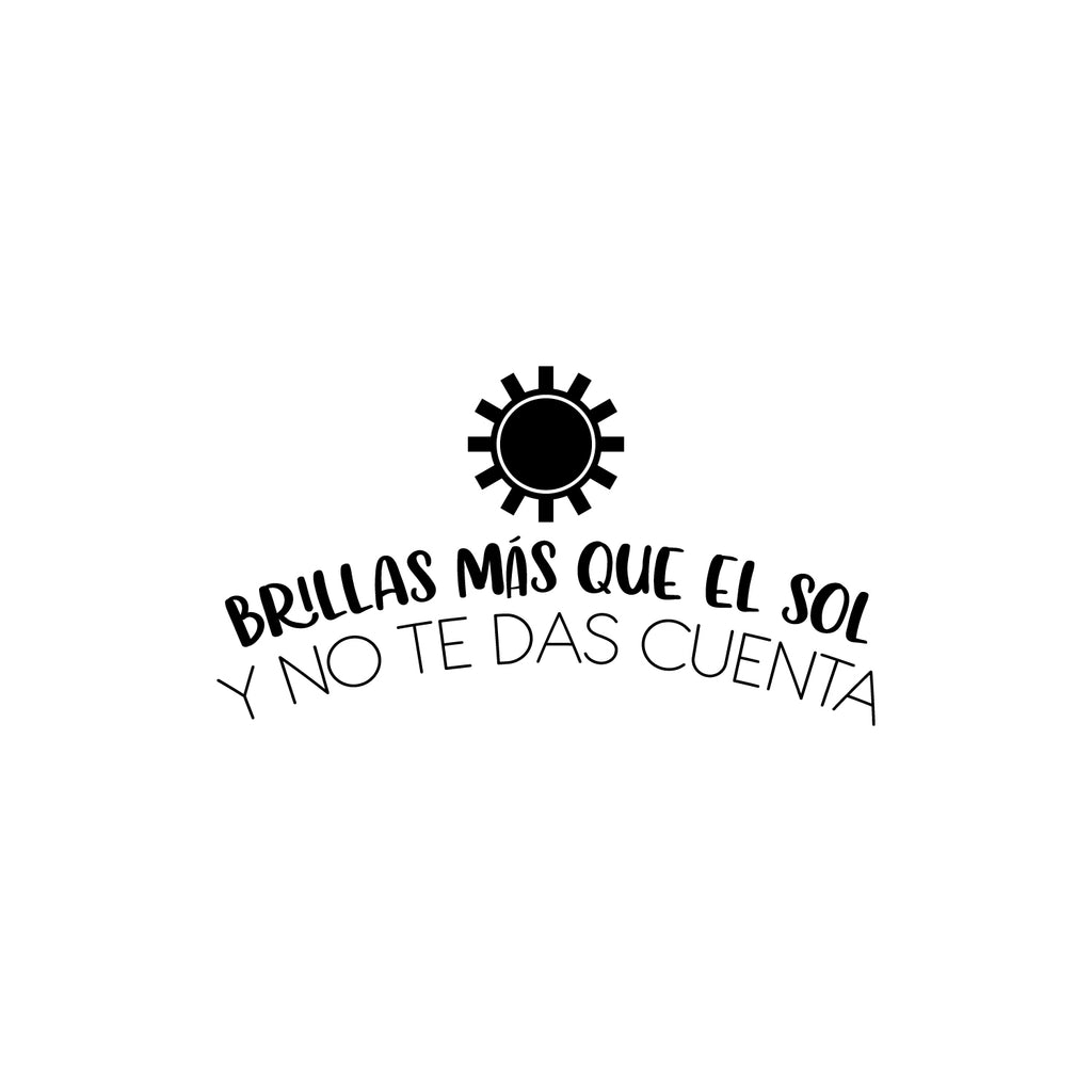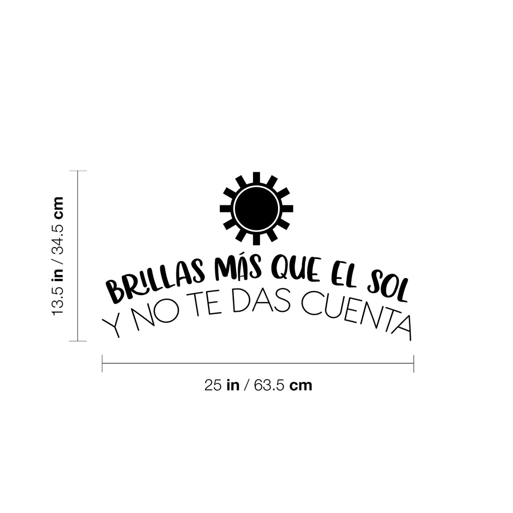 This awesome inspirational decal quote "Brillas Más Que El Sol Y No Te Das Cuenta / You Shine More Than The Sun And You Don't Realize It"; is the perfect touch for your home or school. Use it for your living room; classroom; office or anywhere you want to bring some extra positive decoration. It's a vinyl sticker that is easy to put on any smooth and dry surface. Our modern designs don't just brighten up the room; but brighten up the day. Using top of the line vinyl across all of our production allows us to be the leaders in quality and design.