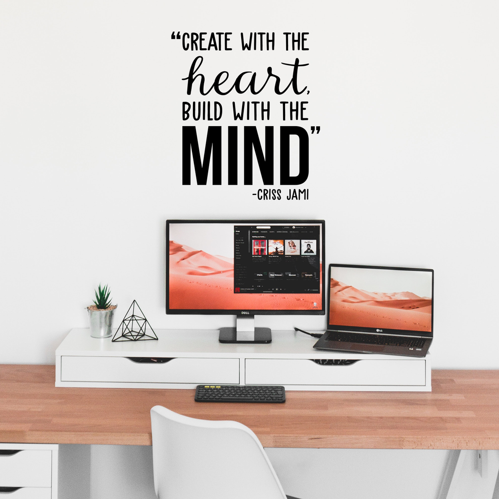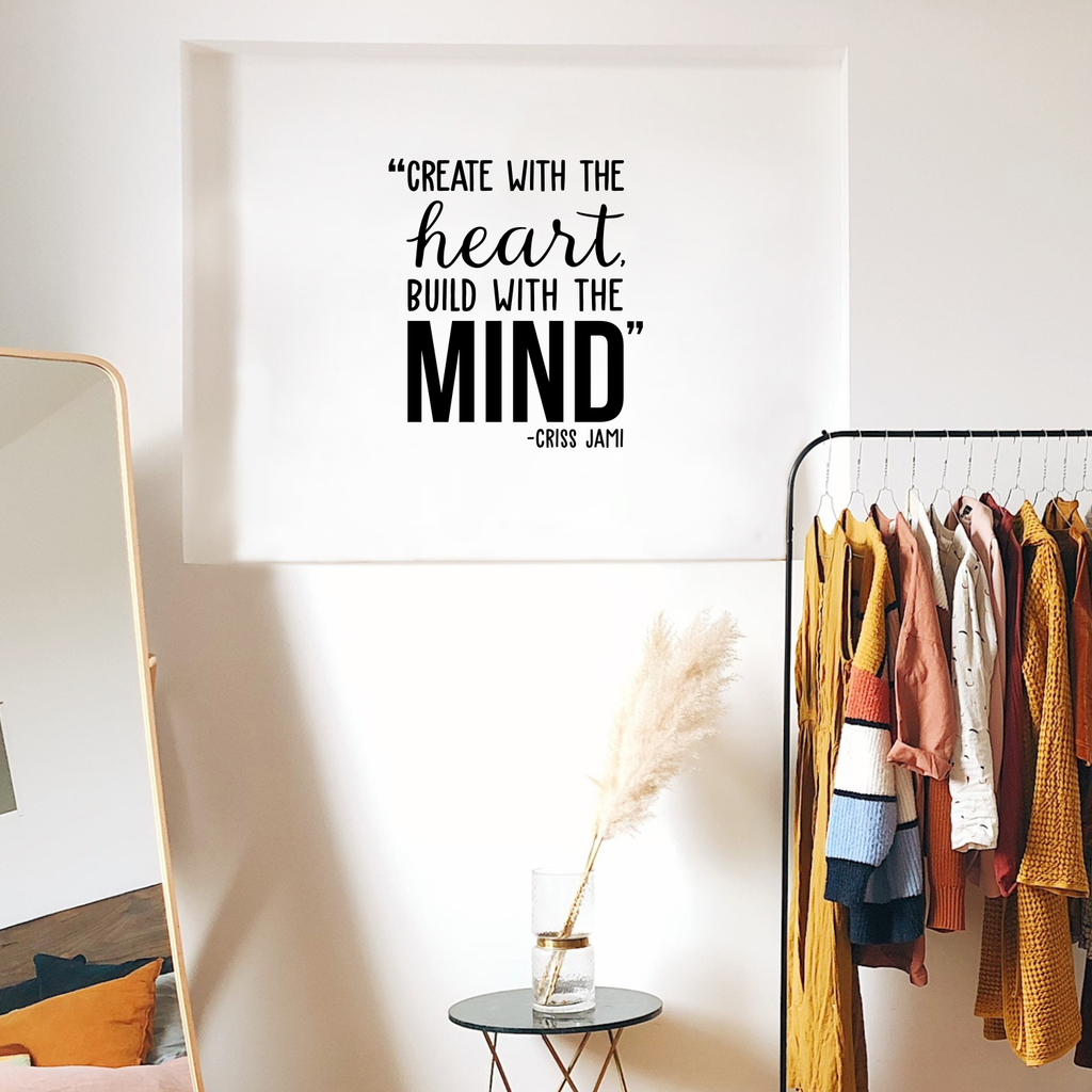 This awesome positive decal quote "Create With The Heart Build With The Mind"; is the perfect touch for your home or office. Use it for your bedroom; kids room; living room or anywhere you want to bring some extra optimistic decoration. It's a vinyl sticker that is easy to put on any smooth and dry surface. Our modern designs don't just brighten up the room; but brighten up the day. Using top of the line vinyl across all of our production allows us to be the leaders in quality and design.