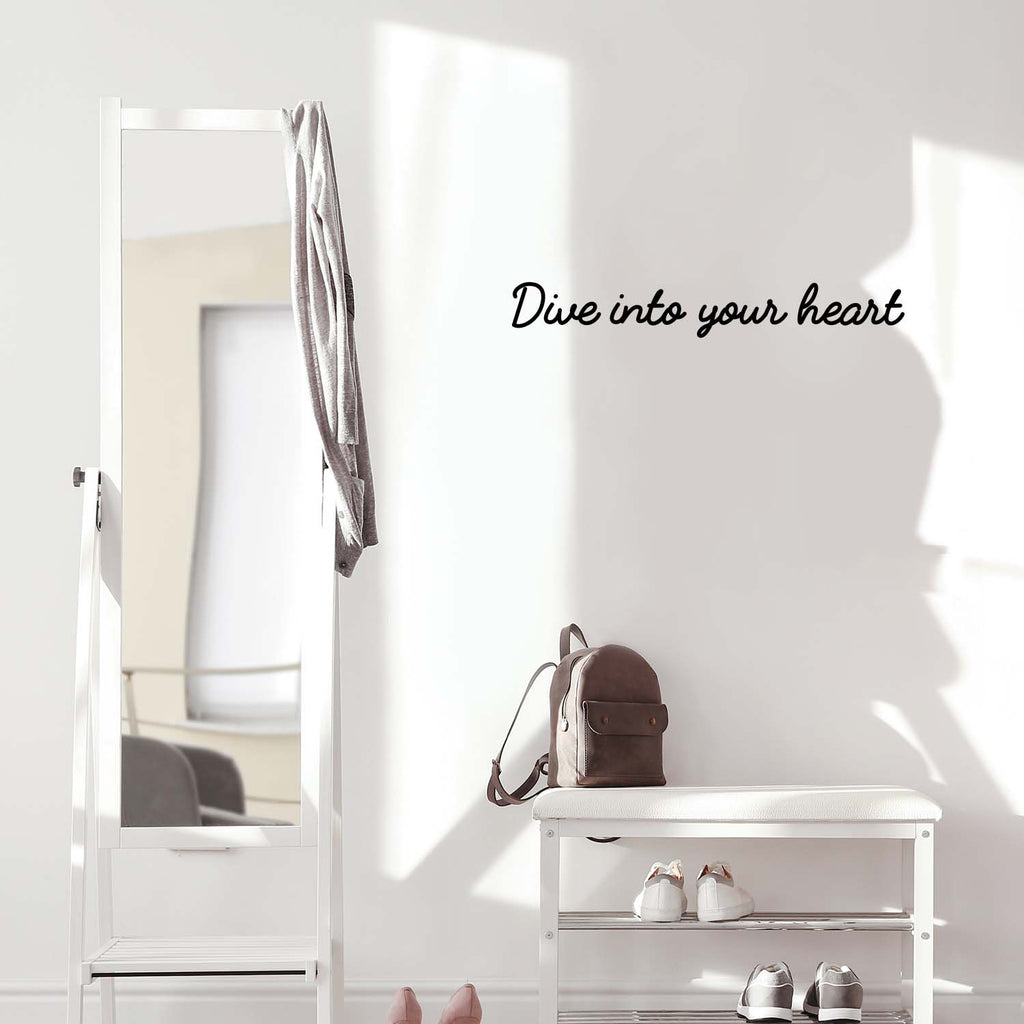 This great decal quote "Dive Into Your Heart"; is the perfect touch for your home. Use it for your makeup area; dorm room or anywhere you want to bring some extra decoration. It's a vinyl sticker that is easy to put on any smooth and dry surface. Our modern designs don't just brighten up the room; but brighten up the day. Using top of the line vinyl across all of our production allows us to be the leaders in quality and design.