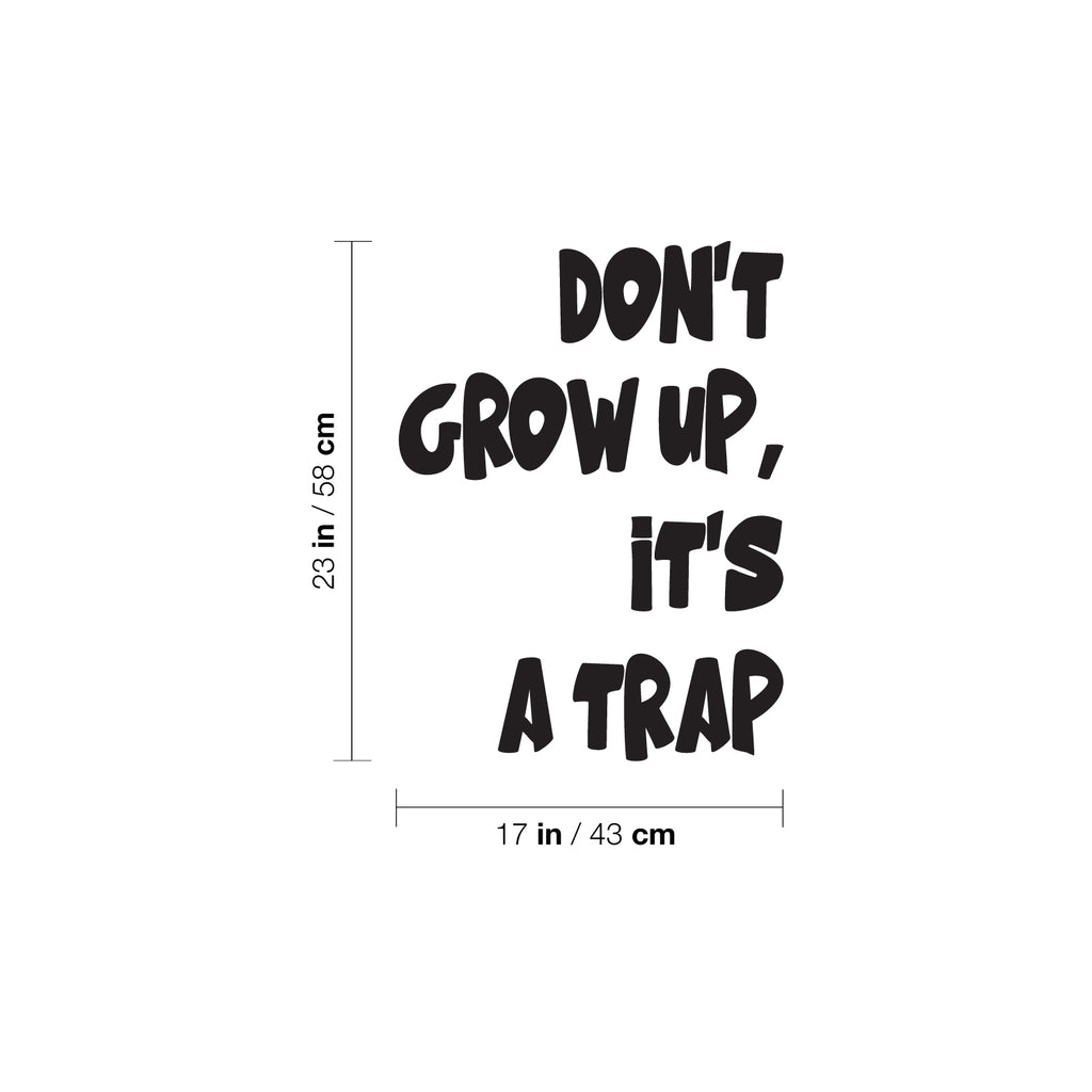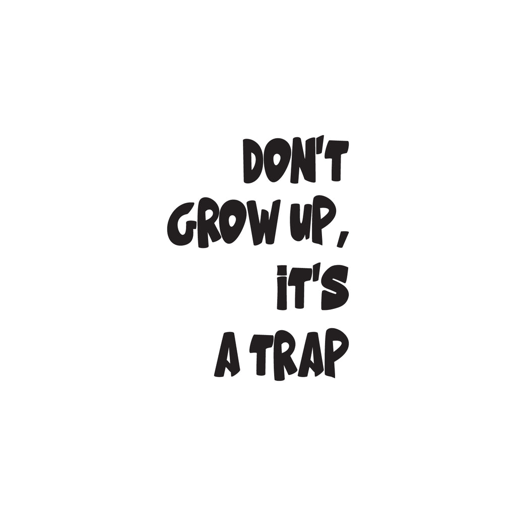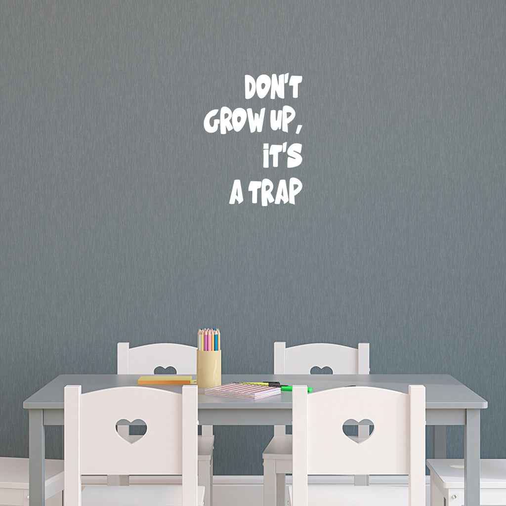 This awesome inspirational decal quote "Don't Grow Up It's A Trap"; is the perfect touch for your home. Use it for your kids bedroom; playroom; daycare or anywhere you want to bring some extra fun decoration. It's a vinyl sticker that is easy to put on any smooth and dry surface. Our modern designs don't just brighten up the room; but brighten up the day. Using top of the line vinyl across all of our production allows us to be the leaders in quality and design.