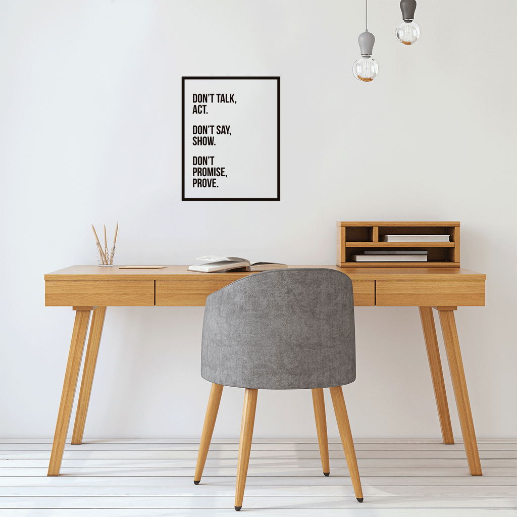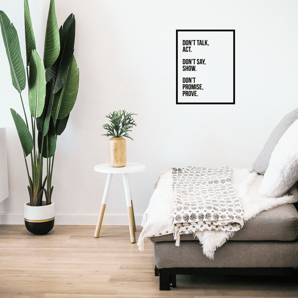 This awesome optimistic decal quote "Don't Talk Act Don't Say Show Don't Promise Prove"; is the perfect touch for your home or store. Use it for your bedroom; living room or anywhere you want to bring some extra cute decoration. It's a vinyl sticker that is easy to put on any smooth and dry surface. Our modern designs don't just brighten up the room; but brighten up the day. Using top of the line vinyl across all of our production allows us to be the leaders in quality and design.