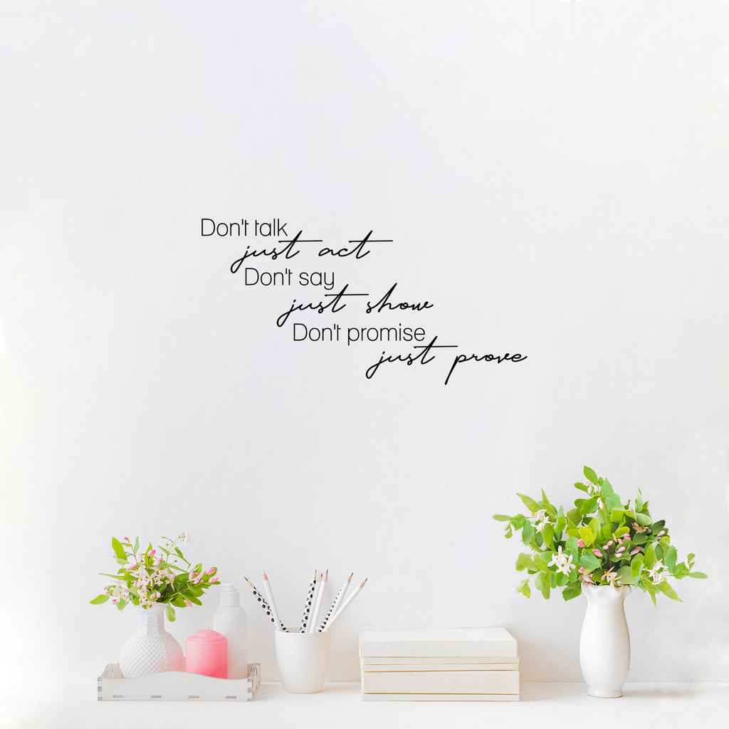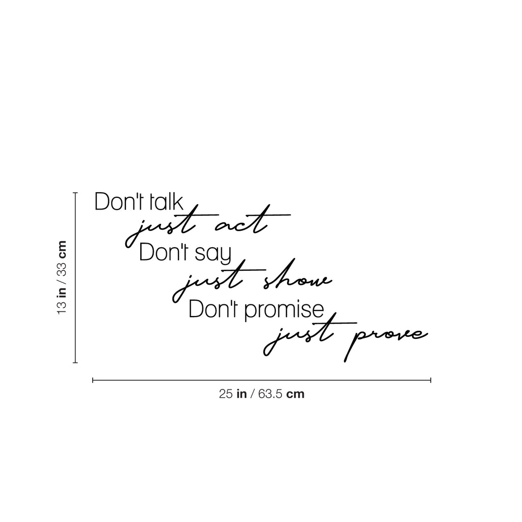 This inspirational decal quote "Don't Talk Just Act Don't Say Just Show"; is the perfect touch for your home or classroom. Use it for your home school; living room; office or anywhere you want to bring some extra decoration. It's a vinyl sticker that is easy to put on any smooth and dry surface. Our modern designs don't just brighten up the room; but brighten up the day. Using top of the line vinyl across all of our production allows us to be the leaders in quality and design.