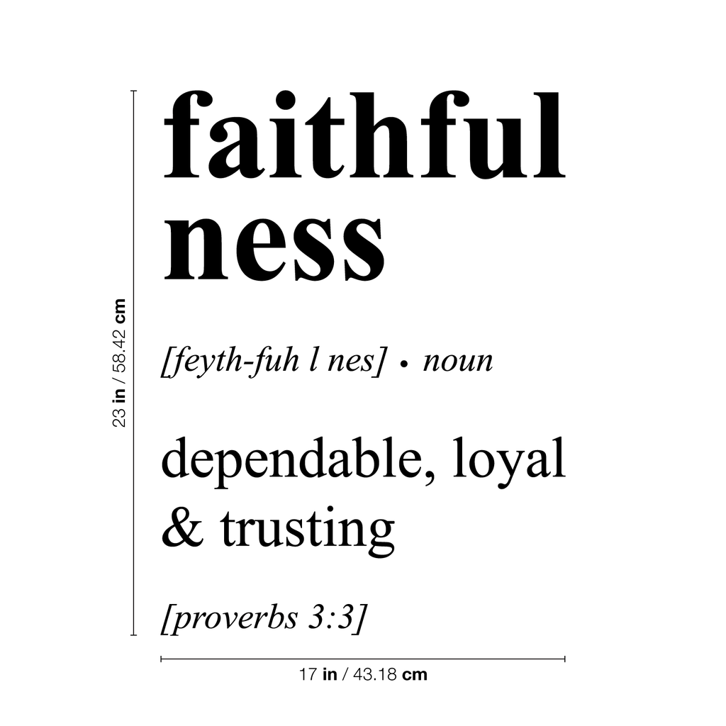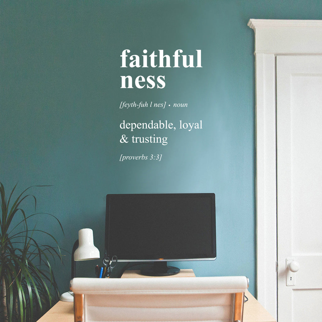 This awesome decal quote "Faithfulness Dependable; Loyal & Trusting - Proverbs 3:3"; is the perfect touch for your home. Use it for your bedroom; office; church or anywhere you want to bring some extra religious decoration. It's a vinyl sticker that is easy to put on any smooth and dry surface. Our modern designs don't just brighten up the room; but brighten up the day. Using top of the line vinyl across all of our production allows us to be the leaders in quality and design.