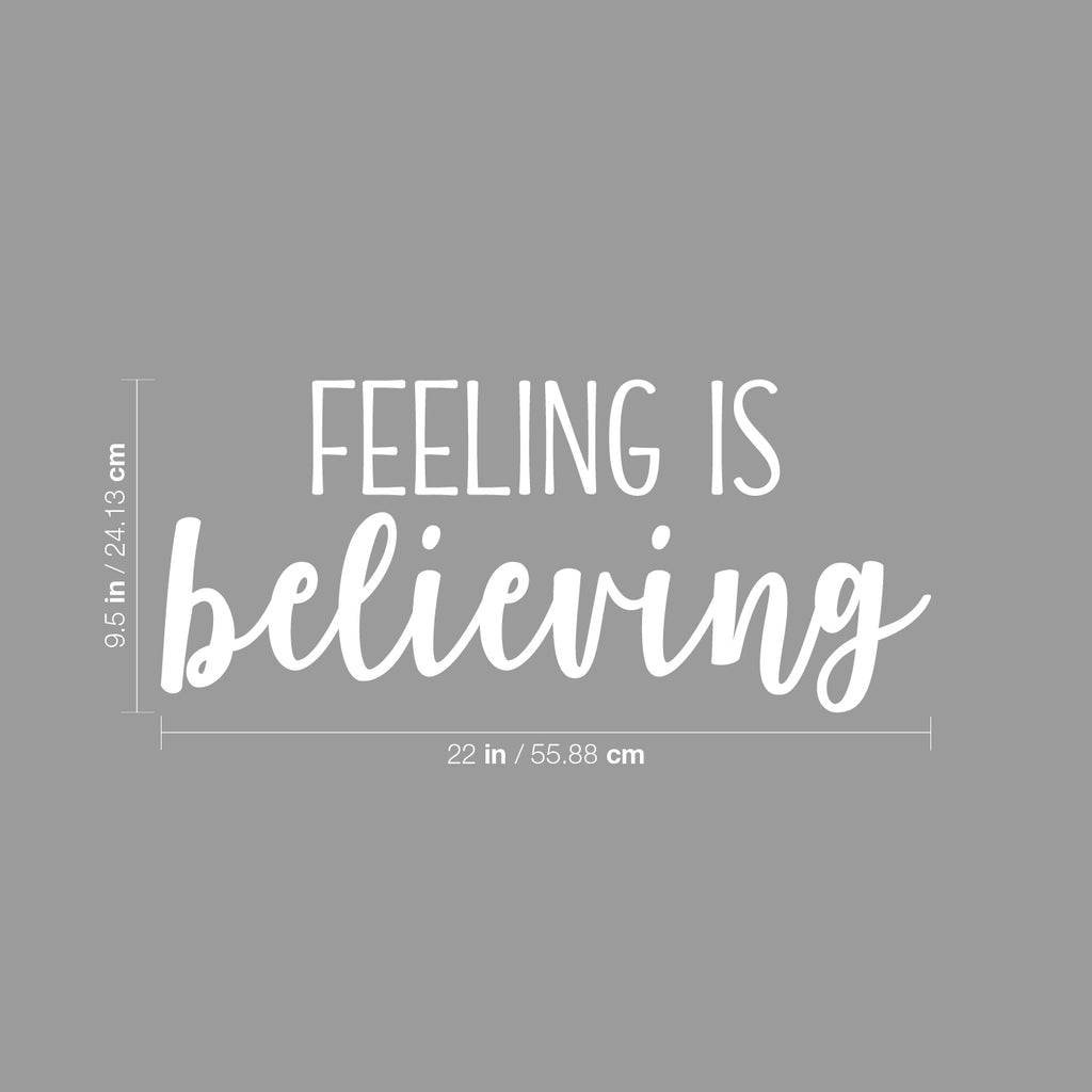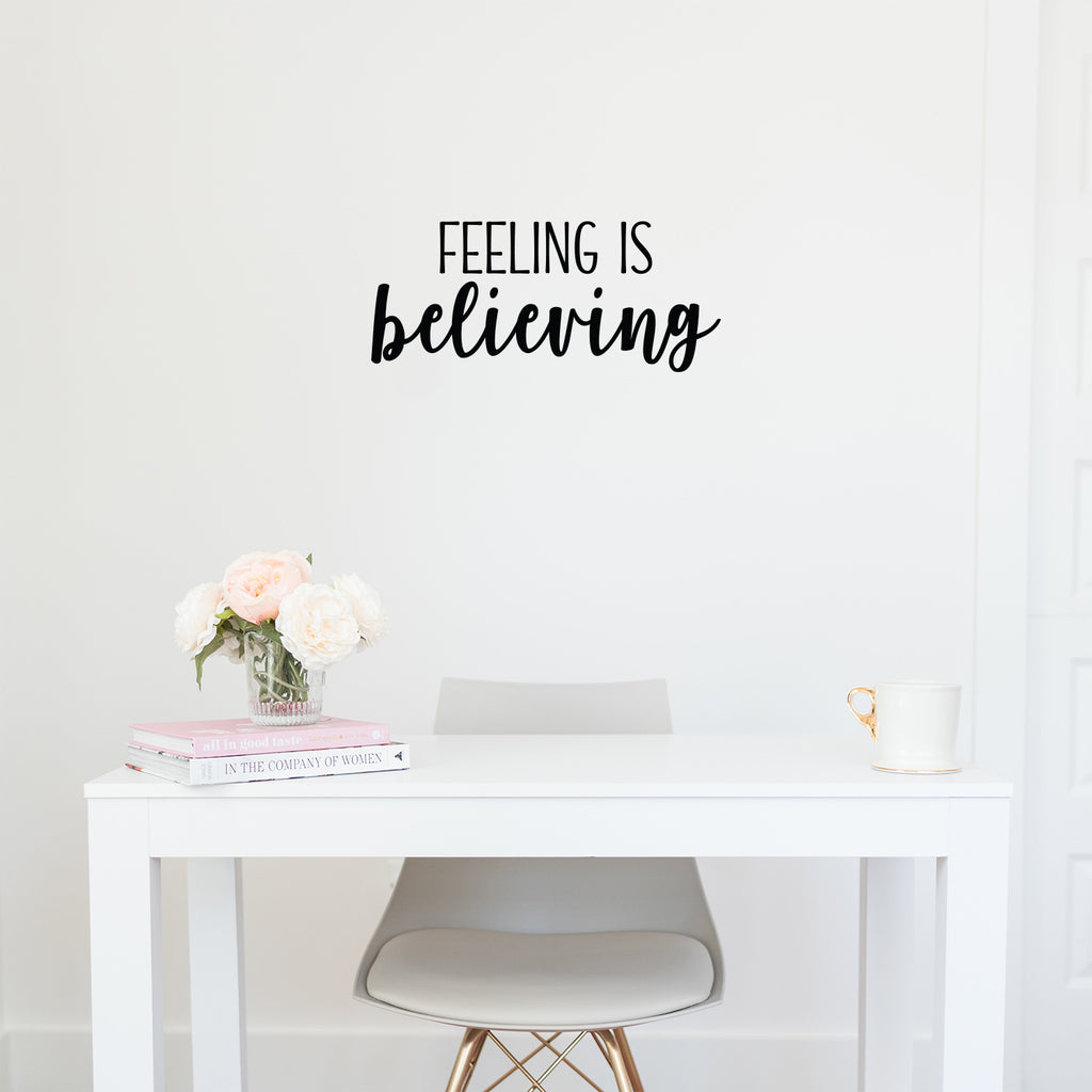 This awesome motivational decal quote "Feeling Is Believing"; is the perfect touch for your home. Use it for your dorm room; home office; apartment or anywhere you want to bring some extra girly decoration. It's a vinyl sticker that is easy to put on any smooth and dry surface. Our modern designs don't just brighten up the room; but brighten up the day. Using top of the line vinyl across all of our production allows us to be the leaders in quality and design.