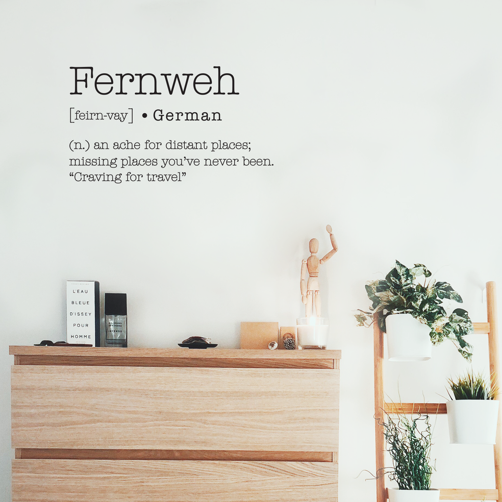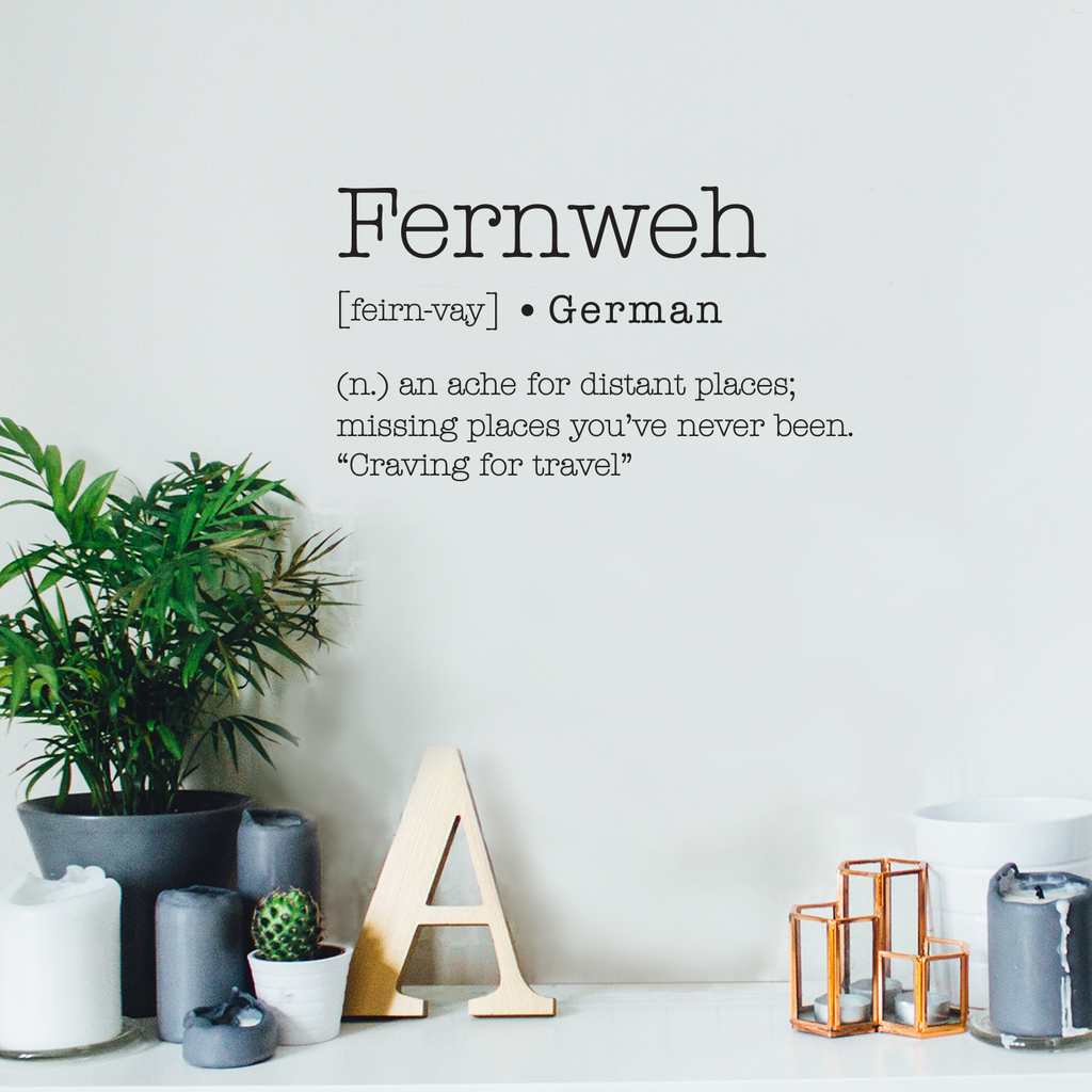 This awesome decal quote "Fernweh Definition"; is the perfect touch for your home. Use it for your living room; apartment or anywhere you want to bring some extra decoration. It's a vinyl sticker that is easy to put on any smooth and dry surface. Our modern designs don't just brighten up the room; but brighten up the day. Using top of the line vinyl across all of our production allows us to be the leaders in quality and design.