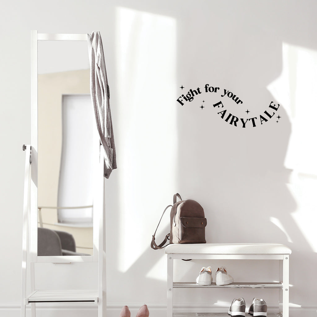 This decal quote "Fight For Your Fairy Tale" is the perfect touch for your home. Use it for your nursery; playroom; kids room or anywhere you want to bring some extra cute decoration. It's a vinyl sticker that is easy to put on any smooth and dry surface. Our modern designs don't just brighten up the room; but brighten up the day. Using top of the line vinyl across all of our production allows us to be the leaders in quality and design.