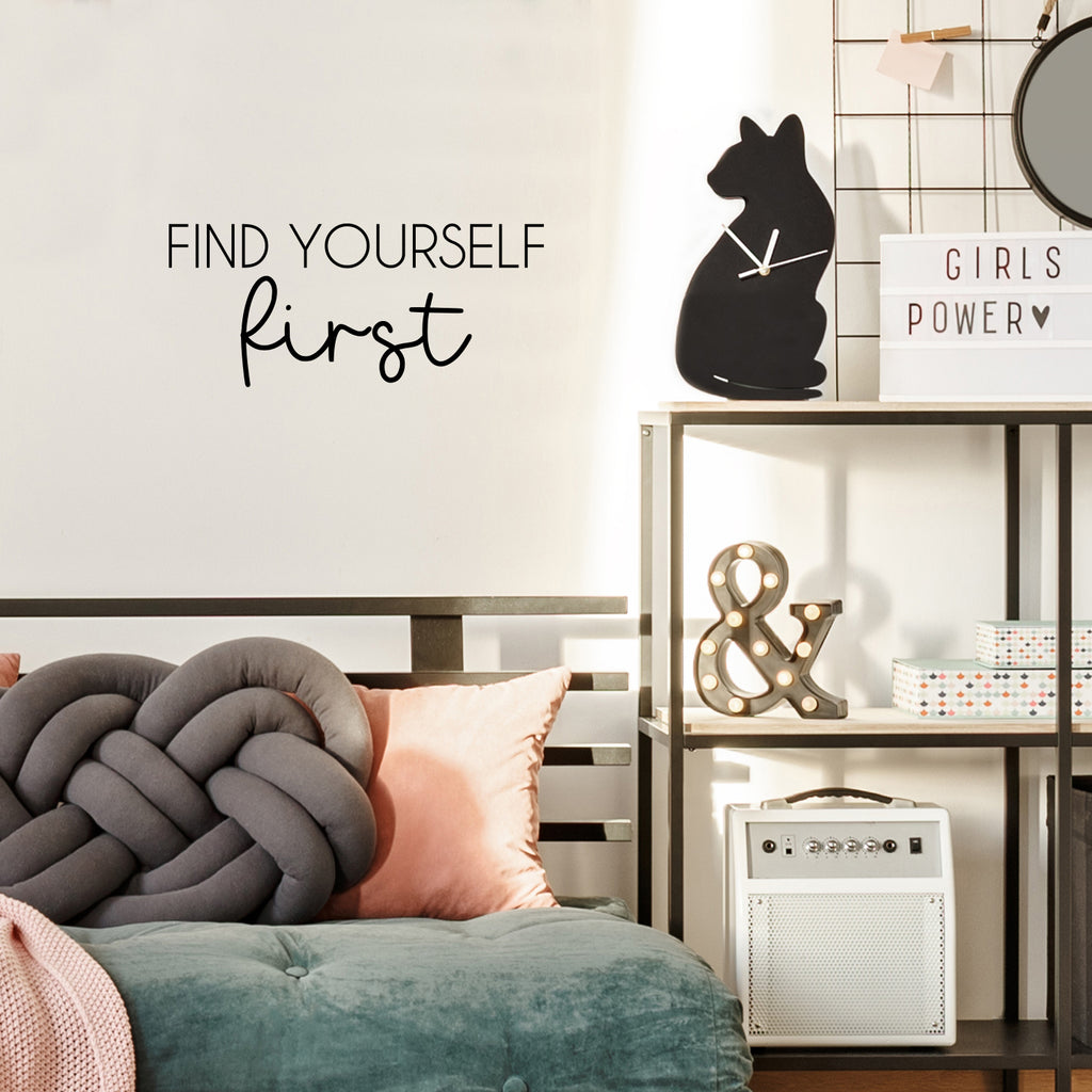 This great decal quote "Find Yourself First"; is the perfect touch for your home. Use it for your makeup area; dorm room or anywhere you want to bring some extra decoration. It's a vinyl sticker that is easy to put on any smooth and dry surface. Our modern designs don't just brighten up the room; but brighten up the day. Using top of the line vinyl across all of our production allows us to be the leaders in quality and design.