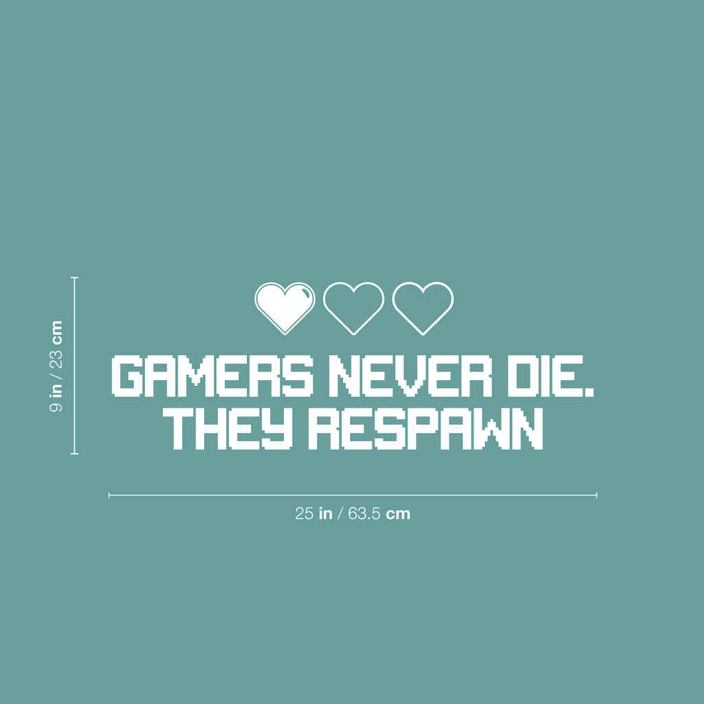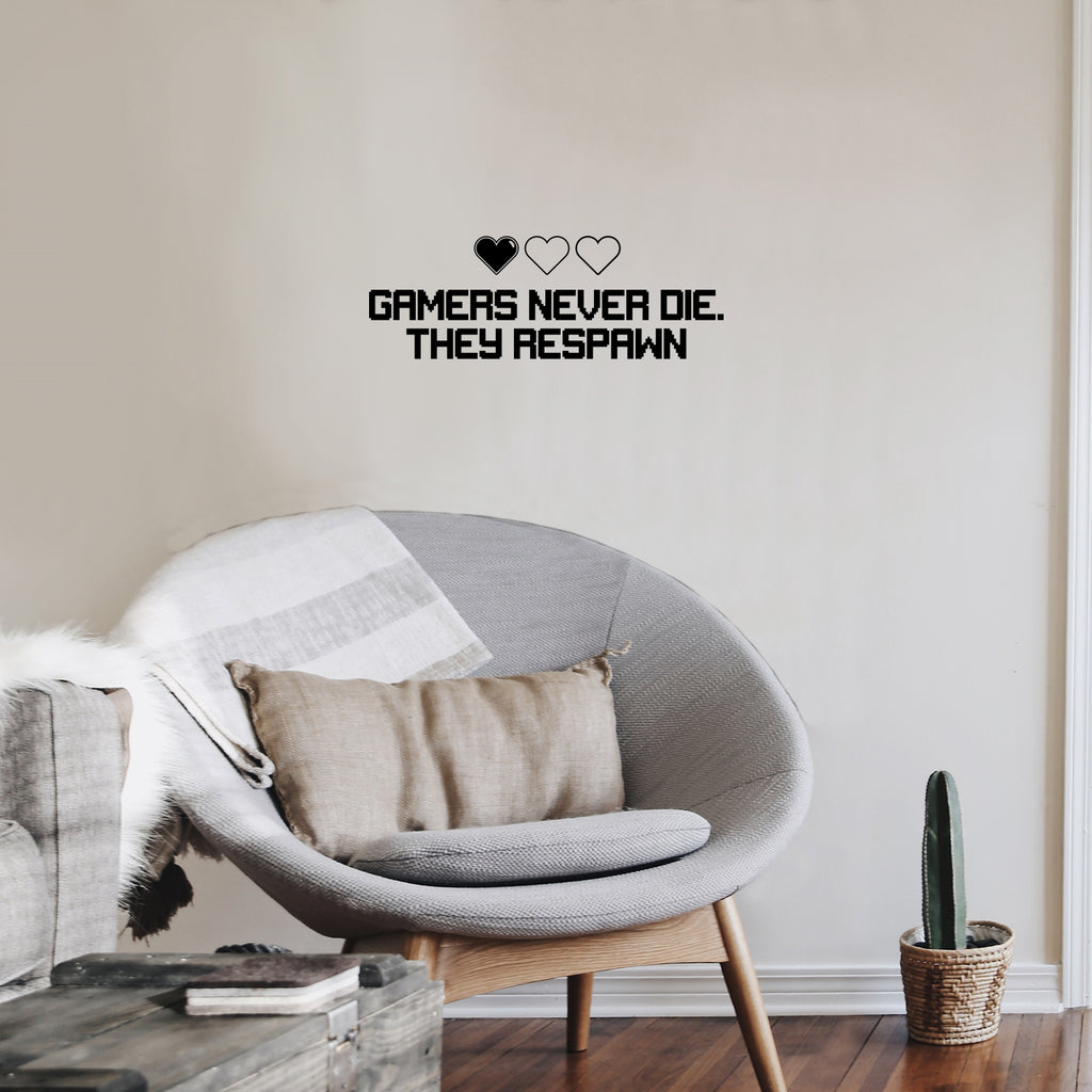 This decal quote "Gamers Never Die They Respawn"; is the perfect touch for your home or work. Use it for your dorm room; home office or anywhere you want to bring some extra decoration. It's a vinyl sticker that is easy to put on any smooth and dry surface. Our modern designs don't just brighten up the room; but brighten up the day. Using top of the line vinyl across all of our production allows us to be the leaders in quality and design.