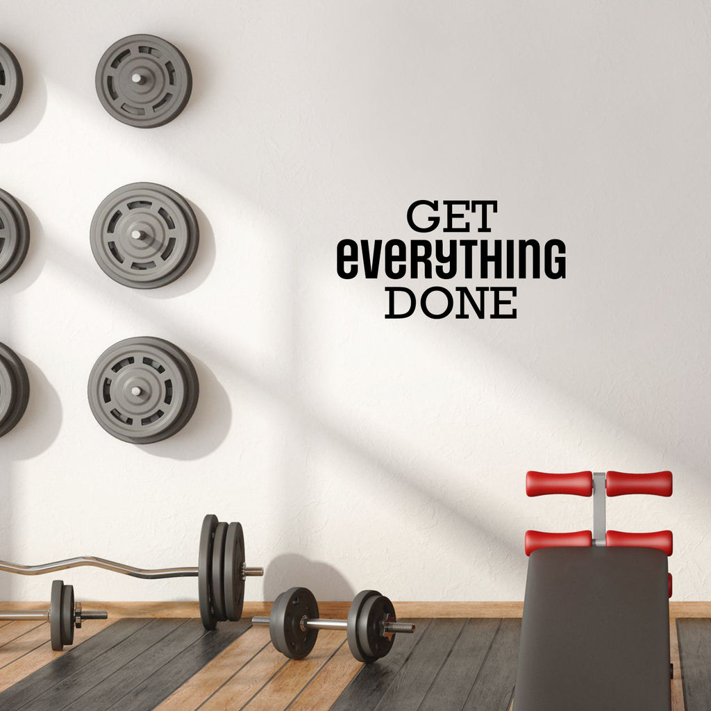 This awesome inspirational decal quote "Get Everything Done"; is the perfect touch for your home or classroom. Use it for your home school; living room; office or anywhere you want to bring some extra decoration. It's a vinyl sticker that is easy to put on any smooth and dry surface. Our modern designs don't just brighten up the room; but brighten up the day. Using top of the line vinyl across all of our production allows us to be the leaders in quality and design.