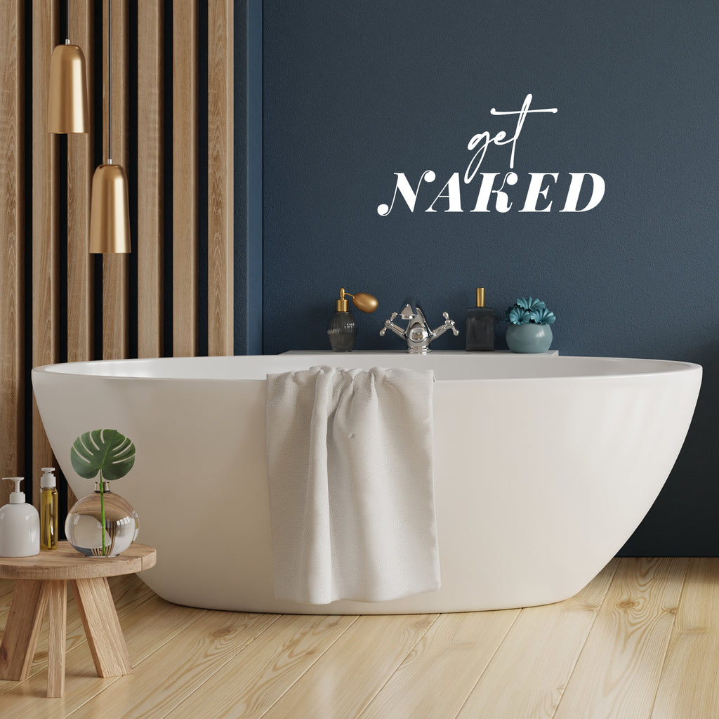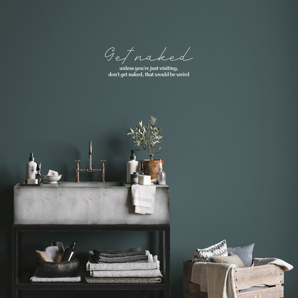 This awesome funny decal quote "Get Naked Unless You're Just Visiting; is the perfect touch for your home. Use it for your bathroom; laundry room; washing space or anywhere you want to bring some extra positive decoration. It's a vinyl sticker that is easy to put on any smooth and dry surface. Our modern designs don't just brighten up the room; but brighten up the day. Using top of the line vinyl across all of our production allows us to be the leaders in quality and design.