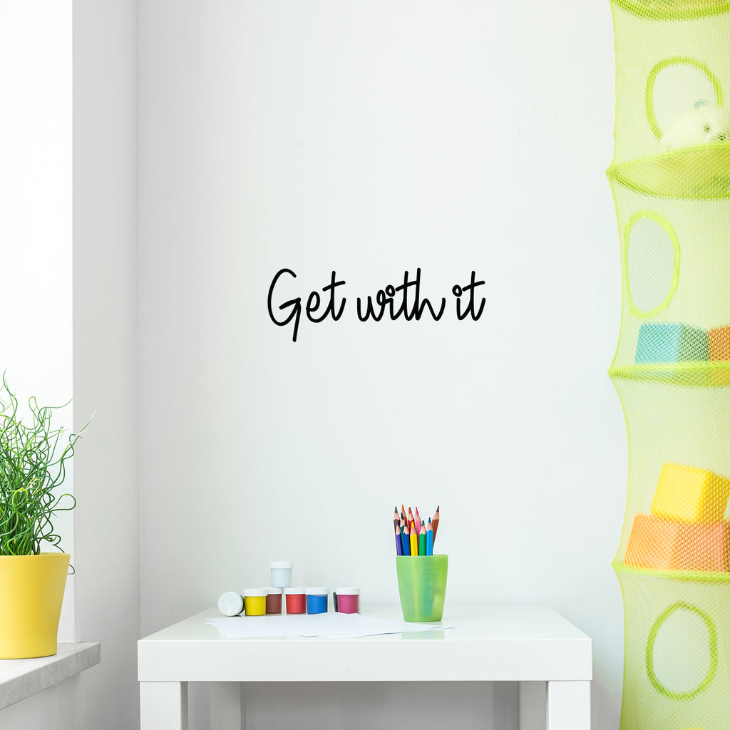 This positive decal quote "Get With It"; is the perfect touch for your home or workplace. Use it for your bedroom; playroom or anywhere you want to bring some extra girly decoration. It's a vinyl sticker that is easy to put on any smooth and dry surface. Our modern designs don't just brighten up the room; but brighten up the day. Using top of the line vinyl across all of our production allows us to be the leaders in quality and design.