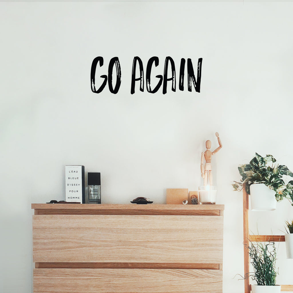 This awesome motivational & positive decal quote "Go Again"; is the perfect touch for your home or school. Use it for your living room; office; coffee shop or anywhere you want to bring some extra positive decoration. It's a vinyl sticker that is easy to put on any smooth and dry surface. Our modern designs don't just brighten up the room; but brighten up the day. Using top of the line vinyl across all of our production allows us to be the leaders in quality and design.