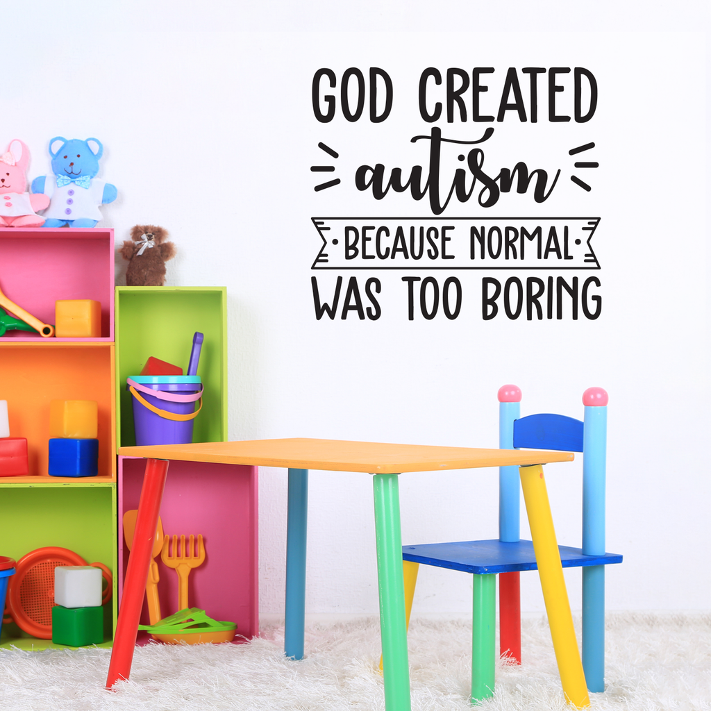 This awesome cute decal quote "God Created Autism"; is the perfect touch for your home or work. Use it for your bedroom; closet; living room or anywhere you want to bring some extra positive decoration. It's a vinyl sticker that is easy to put on any smooth and dry surface. Our modern designs don't just brighten up the room; but brighten up the day. Using top of the line vinyl across all of our production allows us to be the leaders in quality and design.