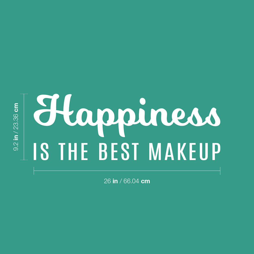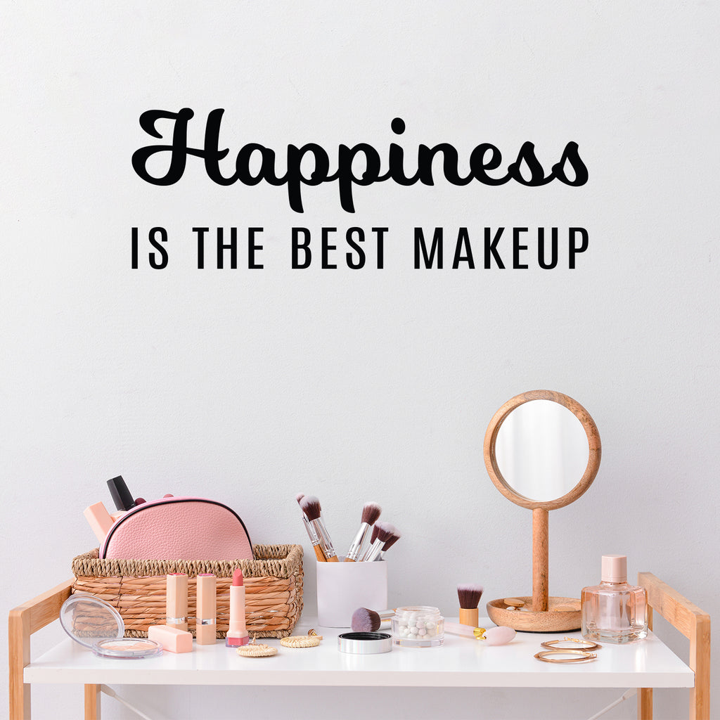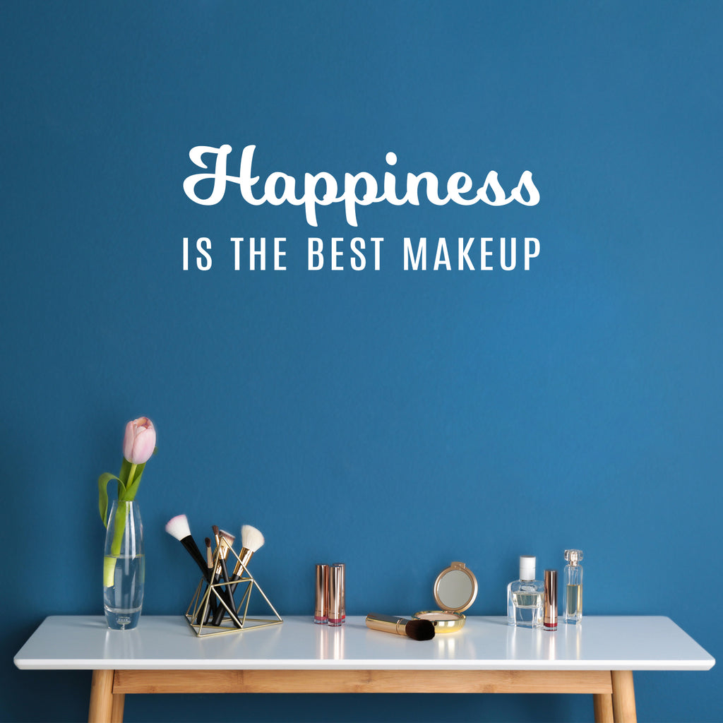 This great decal quote "Happiness Is The Best Makeup"; is the perfect touch for your home. Use it for your dorm room; living room or anywhere you want to bring some extra decoration. It's a vinyl sticker that is easy to put on any smooth and dry surface. Our modern designs don't just brighten up the room; but brighten up the day. Using top of the line vinyl across all of our production allows us to be the leaders in quality and design.