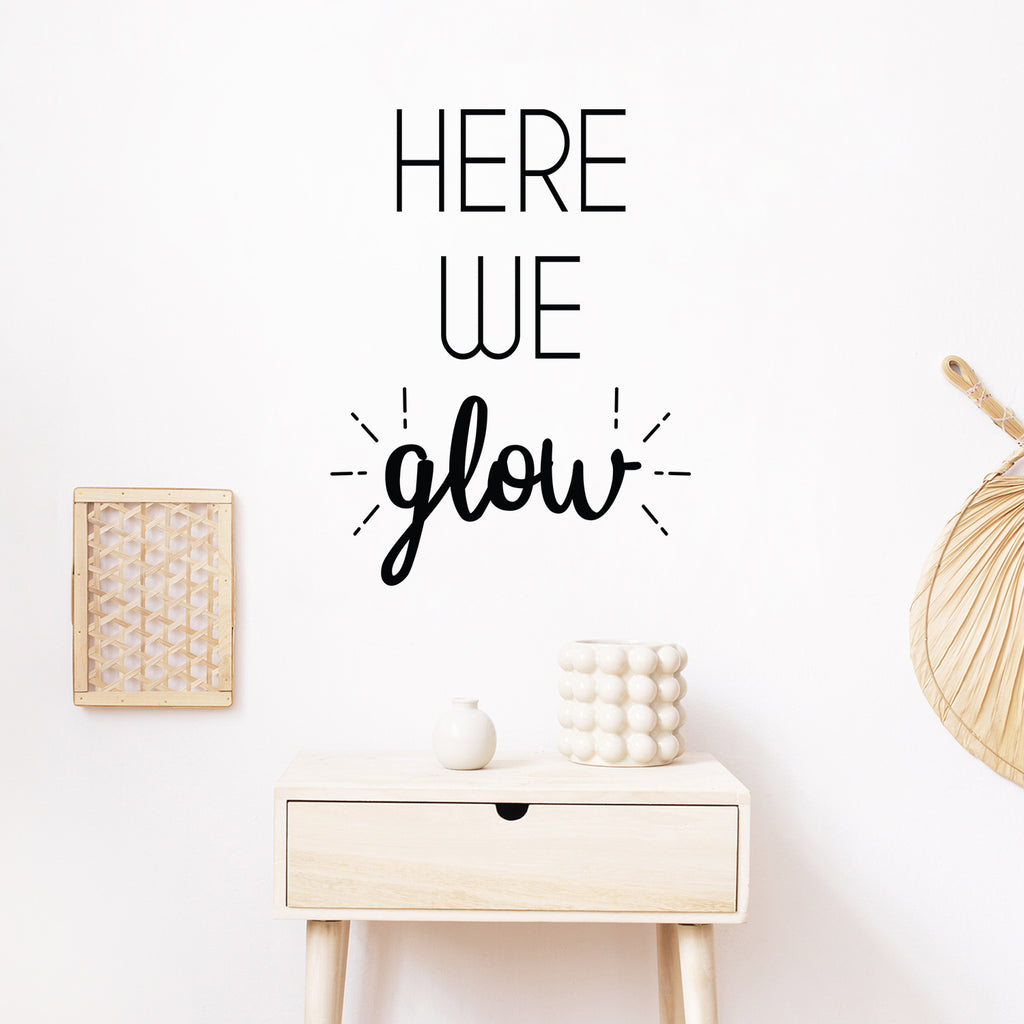 This awesome positive decal quote "Here We Glow"; is the perfect touch for your home or office. Use it for your dorm room; living room or anywhere you want to bring some extra optimistic decoration. It's a vinyl sticker that is easy to put on any smooth and dry surface. Our modern designs don't just brighten up the room; but brighten up the day. Using top of the line vinyl across all of our production allows us to be the leaders in quality and design.