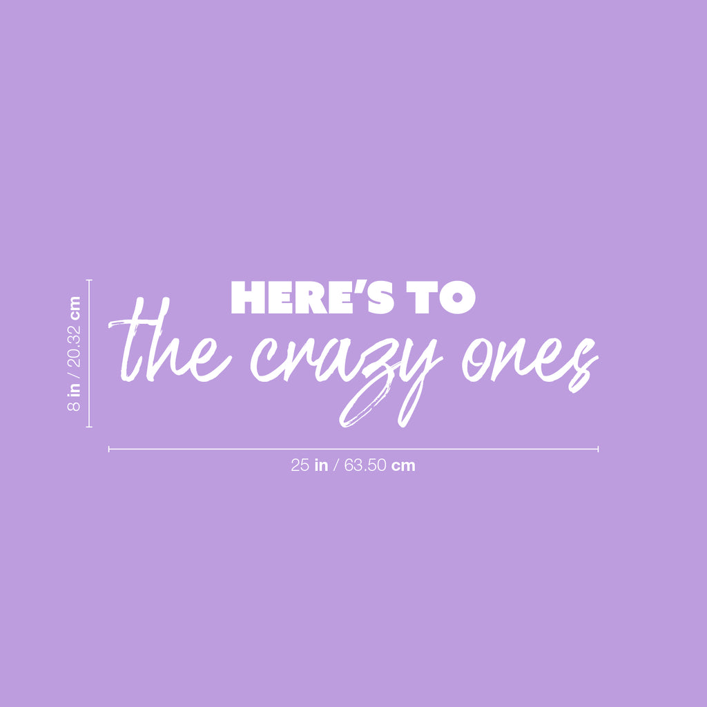 This awesome funny decal quote "Here's To The Crazy Ones"; is the perfect touch for your home or office. Use it for your bedroom; closet; living room or anywhere you want to bring some extra positive decoration. It's a vinyl sticker that is easy to put on any smooth and dry surface. Our modern designs don't just brighten up the room; but brighten up the day. Using top of the line vinyl across all of our production allows us to be the leaders in quality and design.