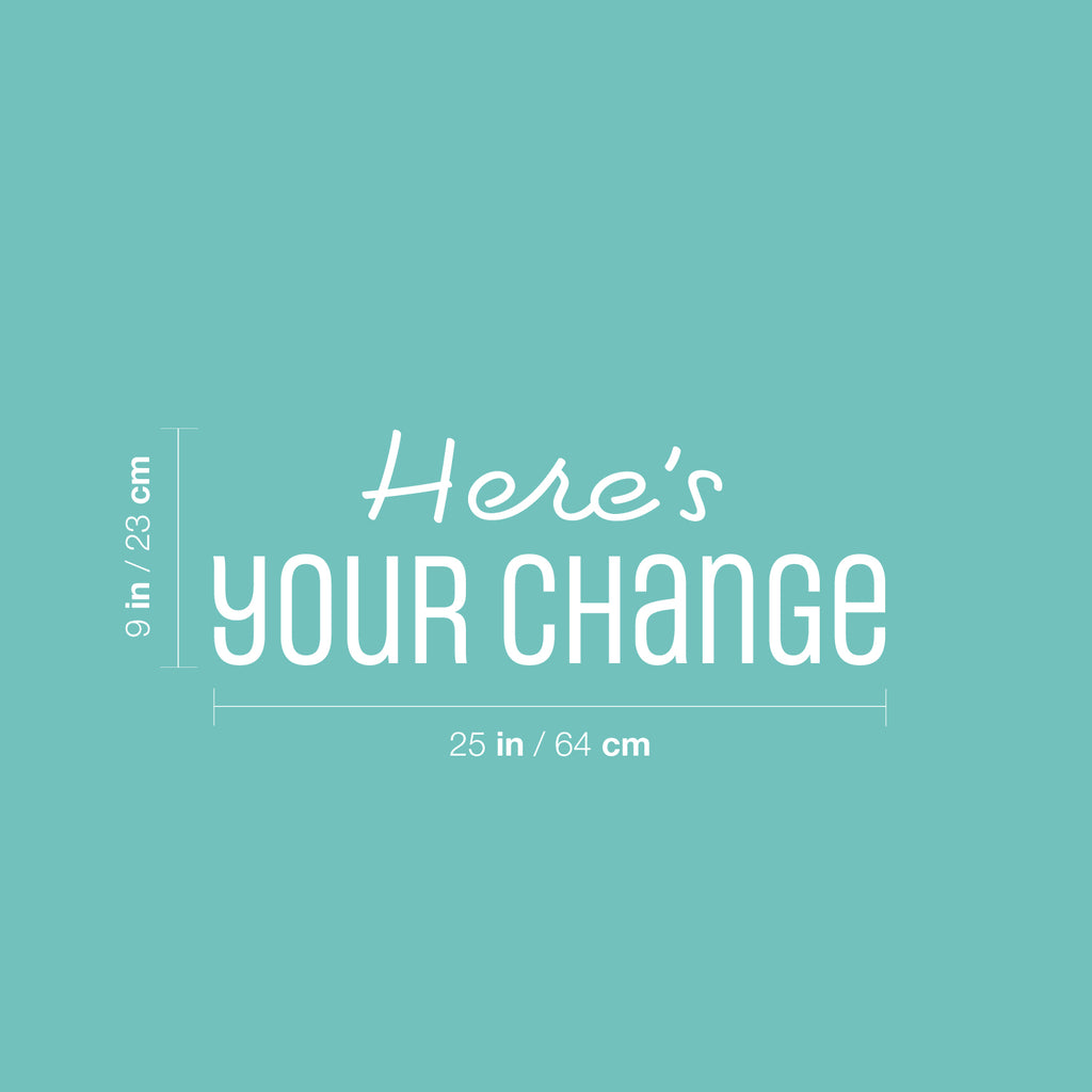 This awesome positive decal quote "Here's Your Change"; is the perfect touch for your home or office. Use it for your playroom; kids room; classroom or anywhere you want to bring some extra positive decoration. It's a vinyl sticker that is easy to put on any smooth and dry surface. Our modern designs don't just brighten up the room; but brighten up the day. Using top of the line vinyl across all of our production allows us to be the leaders in quality and design.