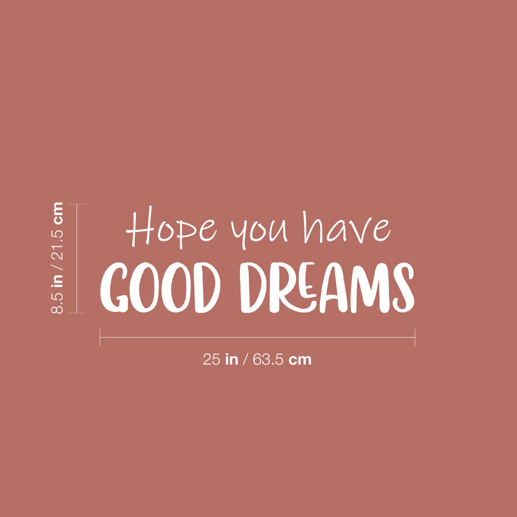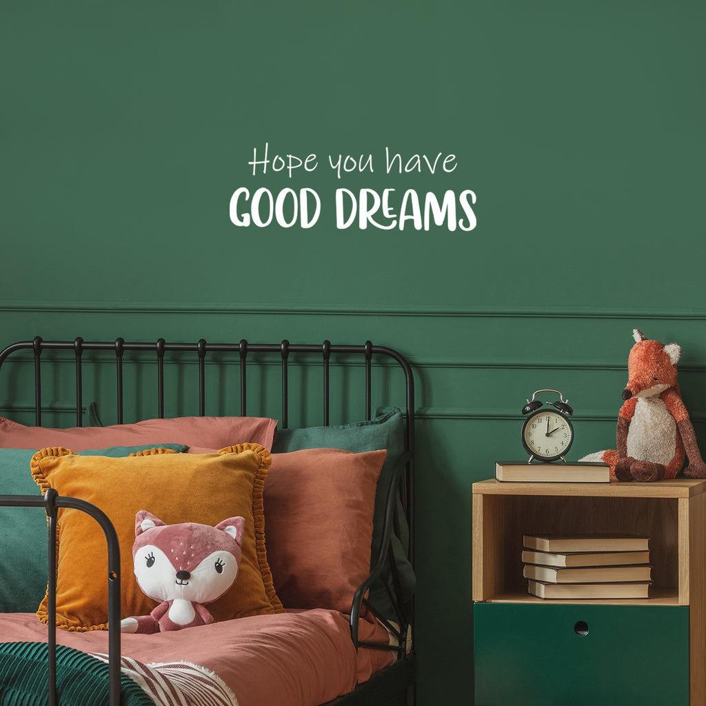 This decal quote "Hope You Have Good Dreams" is the perfect touch for your home. Use it for your nursery; playroom; kids room or anywhere you want to bring some extra cute decoration. It's a vinyl sticker that is easy to put on any smooth and dry surface. Our modern designs don't just brighten up the room; but brighten up the day. Using top of the line vinyl across all of our production allows us to be the leaders in quality and design.