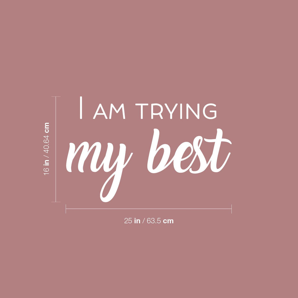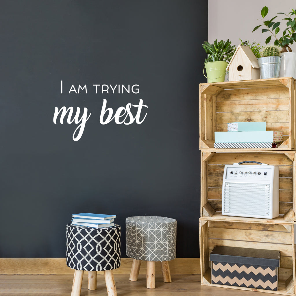 This great positive decal quote "I Am Trying My Best"; is the perfect touch for your home. Use it for your bedroom; playroom; living room or anywhere you want to bring some extra cute decoration. It's a vinyl sticker that is easy to put on any smooth and dry surface. Our modern designs don't just brighten up the room; but brighten up the day. Using top of the line vinyl across all of our production allows us to be the leaders in quality and design.
