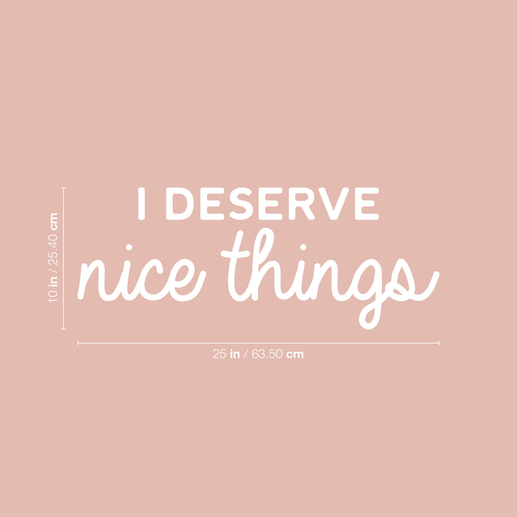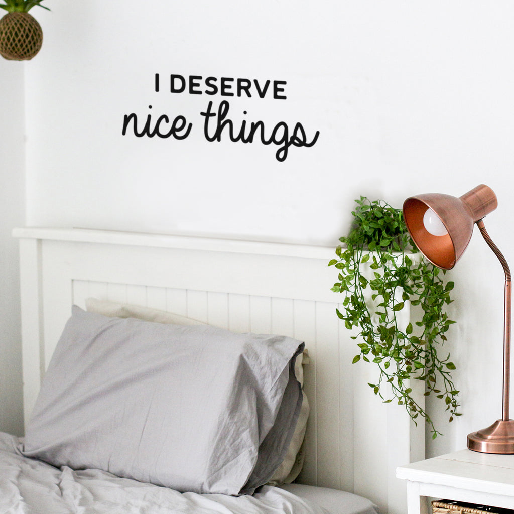 This awesome motivational & positive decal quote "I Deserve Nice Things"; is the perfect touch for your home or office. Use it for your bedroom; living room; classroom or anywhere you want to bring some extra positive decoration. It's a vinyl sticker that is easy to put on any smooth and dry surface. Our modern designs don't just brighten up the room; but brighten up the day. Using top of the line vinyl across all of our production allows us to be the leaders in quality and design.