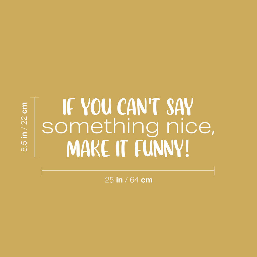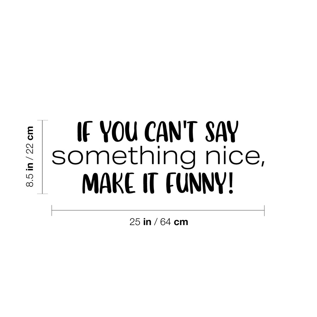 This awesome fun & positive decal quote "If You Can't Say Something Nice; Make It Funny!"; is the perfect touch for your home. Use it for your living room; office; boutique or anywhere you want to bring some extra positive decoration. It's a vinyl sticker that is easy to put on any smooth and dry surface. Our modern designs don't just brighten up the room; but brighten up the day. Using top of the line vinyl across all of our production allows us to be the leaders in quality and design.