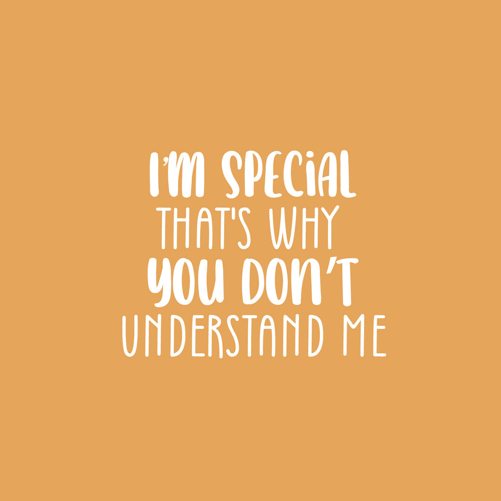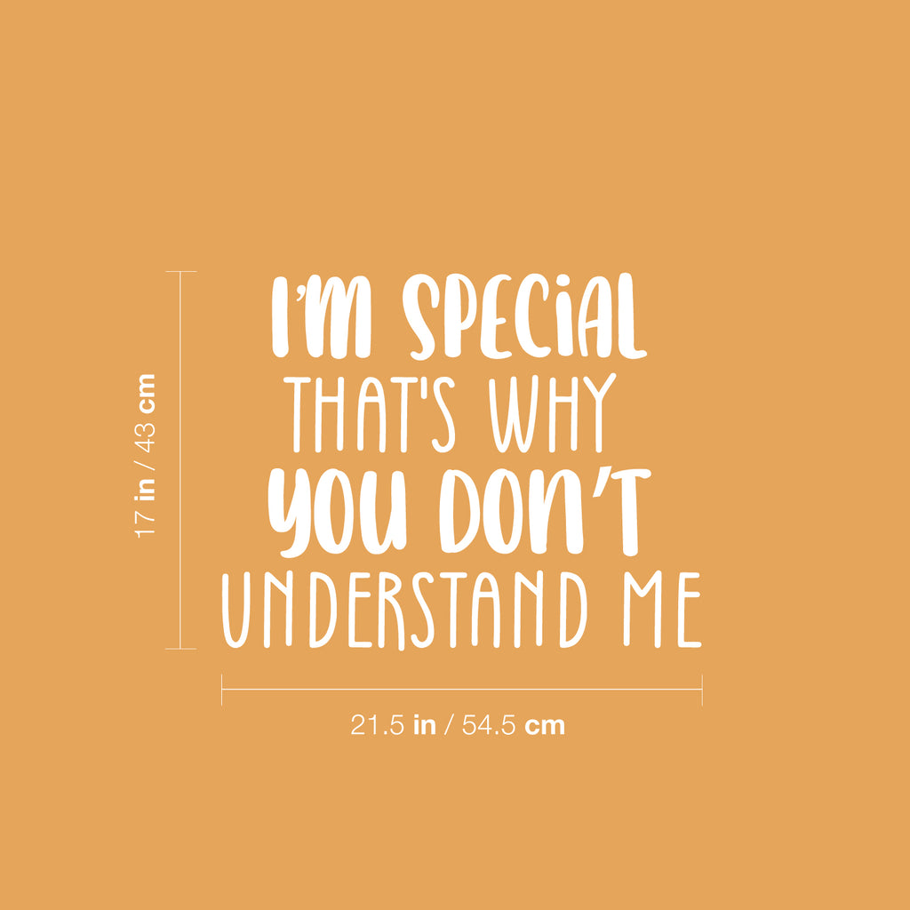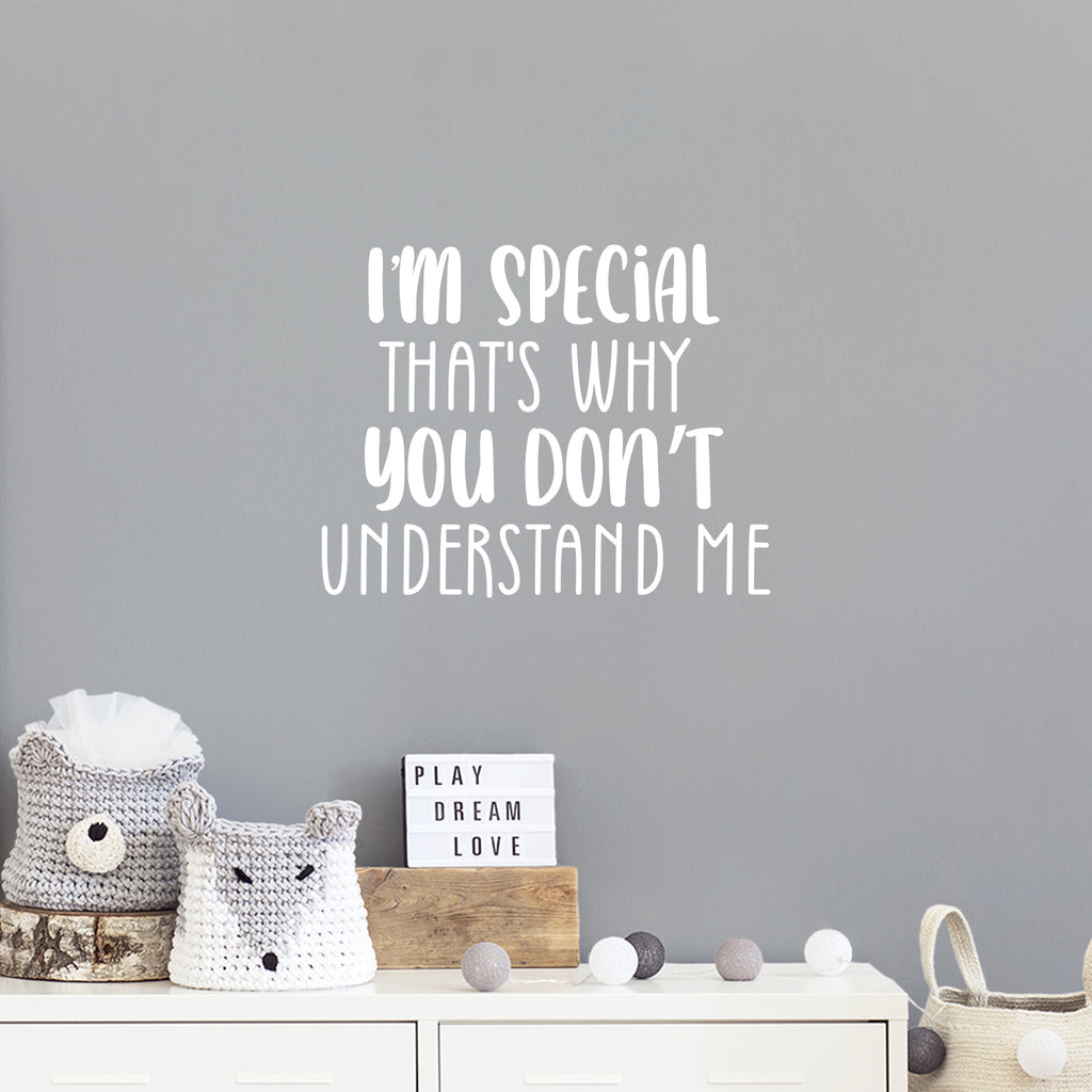 This awesome positive decal quote "I'm Special That's Why You Don't Understand Me"; is the perfect touch for your home or office. Use it for your store; coffee shop; work or anywhere you want to bring some extra inspiring decoration. It's a vinyl sticker that is easy to put on any smooth and dry surface. Our modern designs don't just brighten up the room; but brighten up the day. Using top of the line vinyl across all of our production allows us to be the leaders in quality and design.