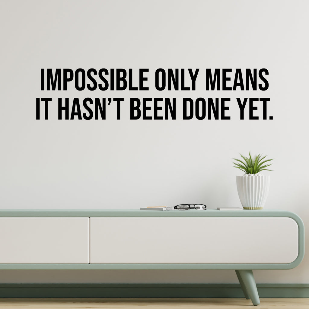 This awesome positive decal quote "Impossible Only Means It Hasn't Been Done Yet"; is the perfect touch for your home. Use it for your office; fitness center; storefront or anywhere you want to bring some extra positive decoration. It's a vinyl sticker that is easy to put on any smooth and dry surface. Our modern designs don't just brighten up the room; but brighten up the day. Using top of the line vinyl across all of our production allows us to be the leaders in quality and design.