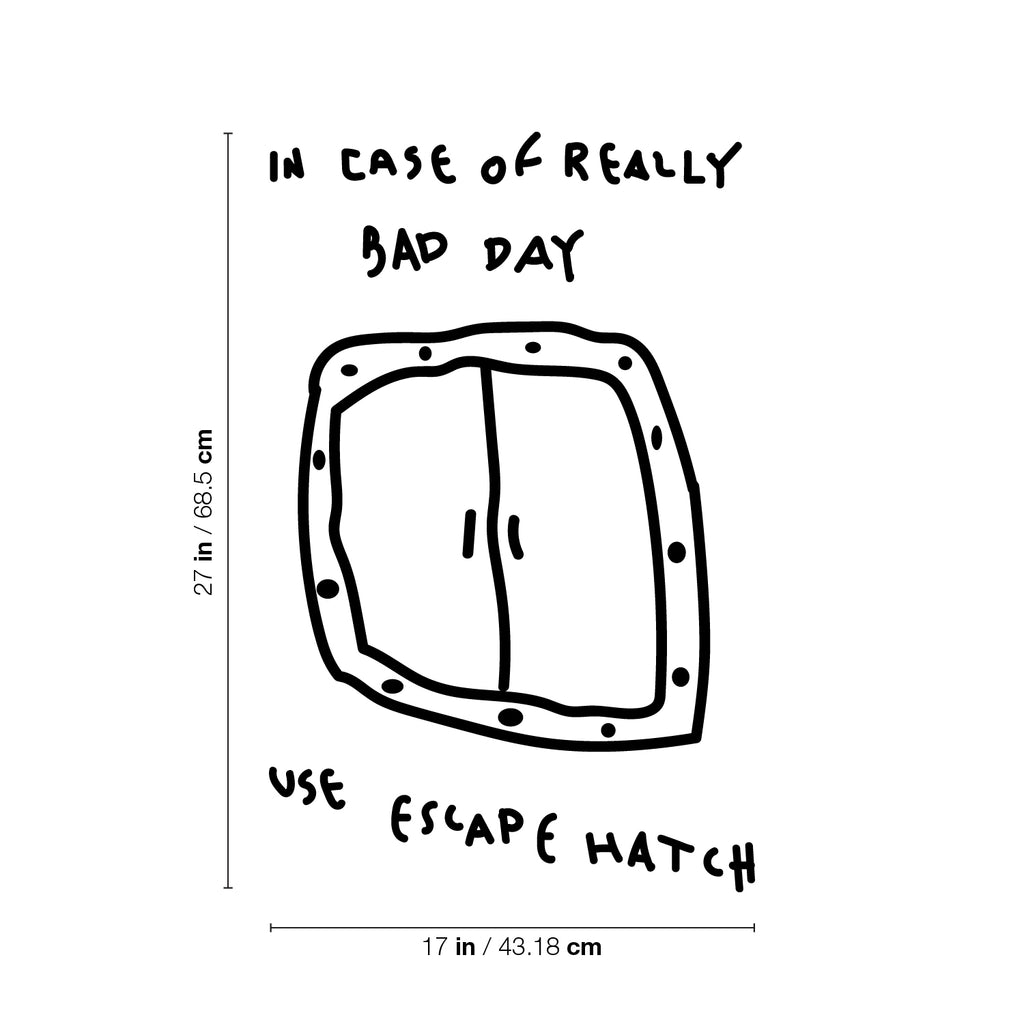 This cute & fun decal quote "In Case Of Really Bad Day Use Escape Hatch"; is the perfect touch for your home or office. Use it for your kids room; playroom; classroom or anywhere you want to bring some extra positive decoration. It's a vinyl sticker that is easy to put on any smooth and dry surface. Our modern designs don't just brighten up the room; but brighten up the day. Using top of the line vinyl across all of our production allows us to be the leaders in quality and design.