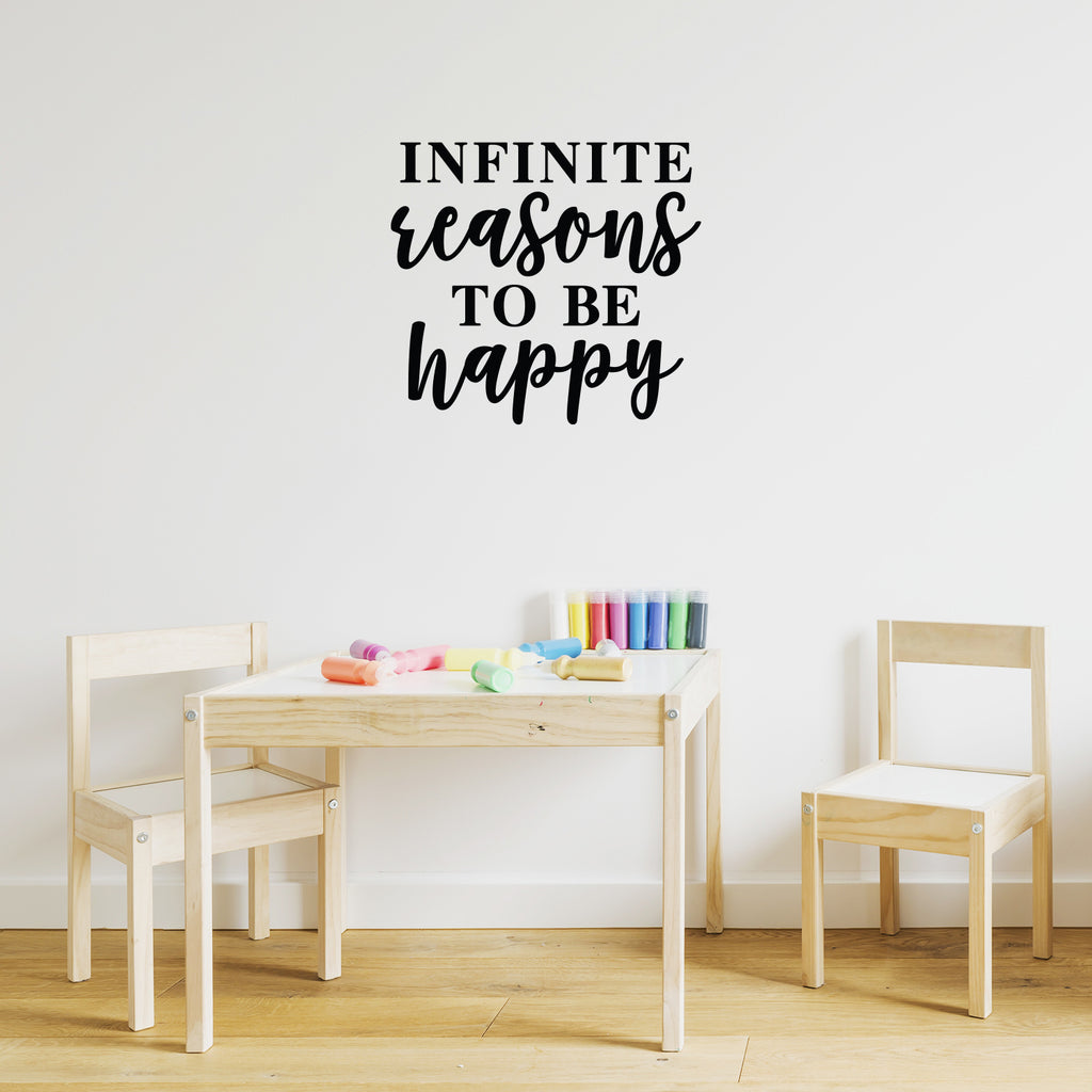 This awesome cute decal quote "Infinite Reasons To Be Happy"; is the perfect touch for your home or kids room. Use it for your living room; apartment; dorm room or anywhere you want to bring some extra cute decoration. It's a vinyl sticker that is easy to put on any smooth and dry surface. Our modern designs don't just brighten up the room; but brighten up the day. Using top of the line vinyl across all of our production allows us to be the leaders in quality and design.