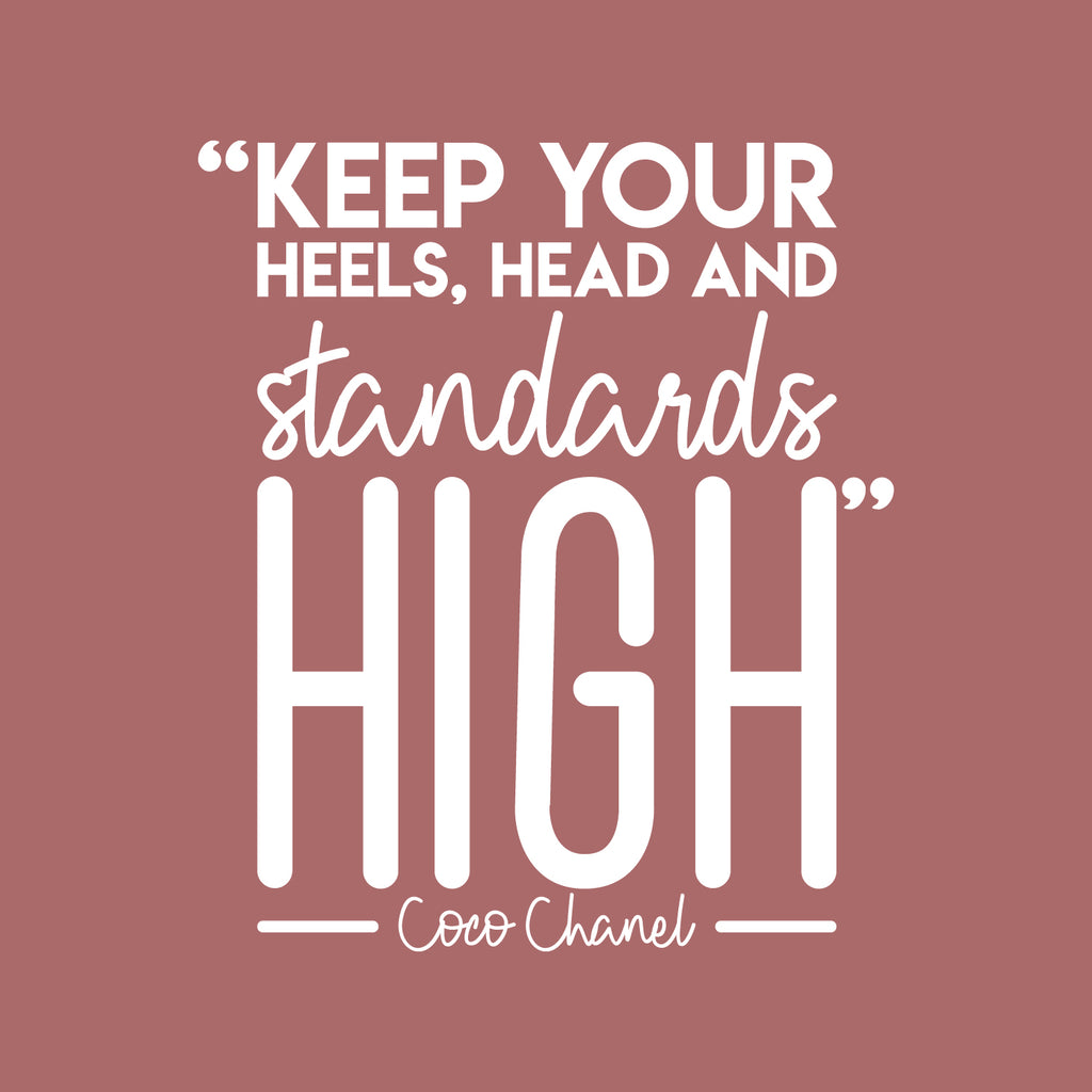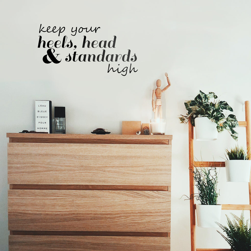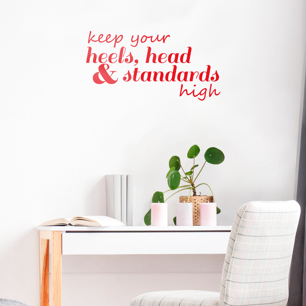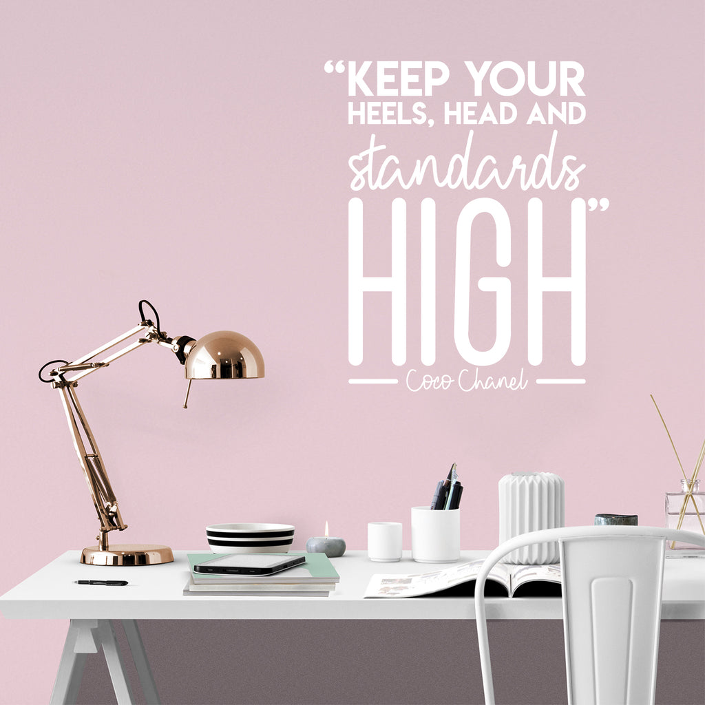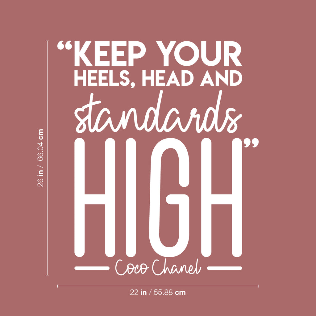 This awesome cute decal quote "Keep Your Heels; Head And Standards High. Coco Chanel"; is the perfect touch for your home or work. Use it for your bedroom; closet; living room or anywhere you want to bring some extra girly decoration. It's a vinyl sticker that is easy to put on any smooth and dry surface. Our modern designs don't just brighten up the room; but brighten up the day. Using top of the line vinyl across all of our production allows us to be the leaders in quality and design.