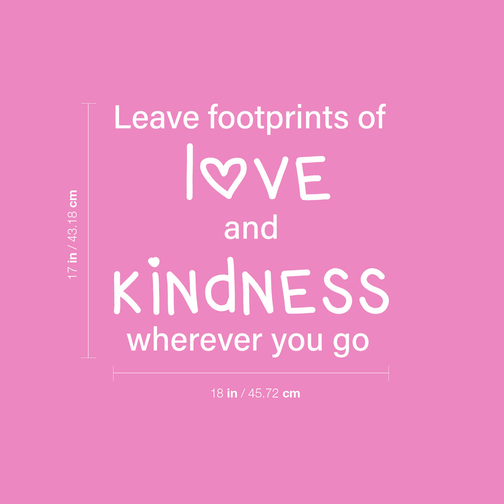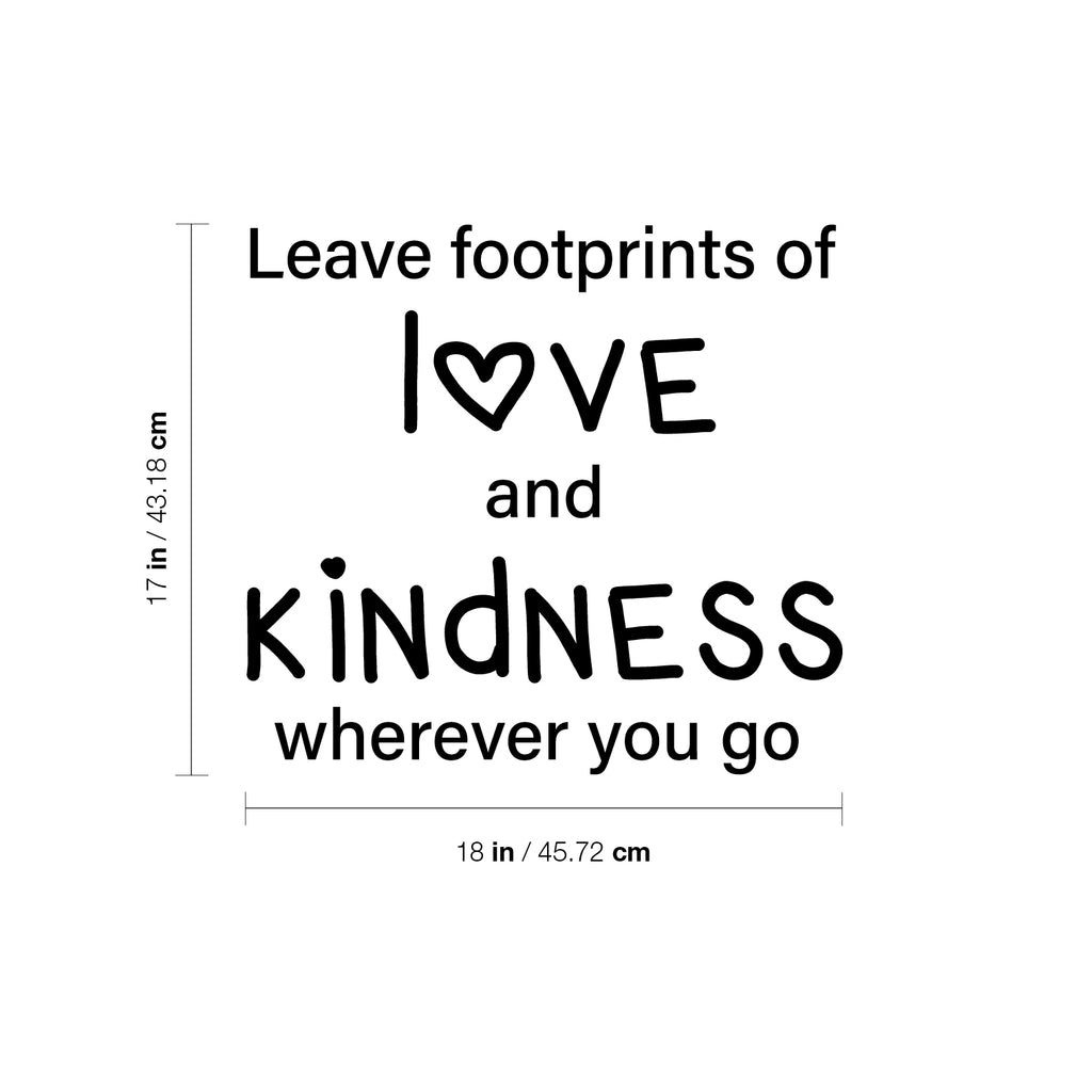 This awesome motivational decal quote "Leave Footprints Of L?ve And Kindness Wherever You Go"; is the perfect touch for your home or school. Use it for your living room; closet; bathroom or anywhere you want to bring some extra cute decoration. It's a vinyl sticker that is easy to put on any smooth and dry surface. Our modern designs don't just brighten up the room; but brighten up the day. Using top of the line vinyl across all of our production allows us to be the leaders in quality and design.
