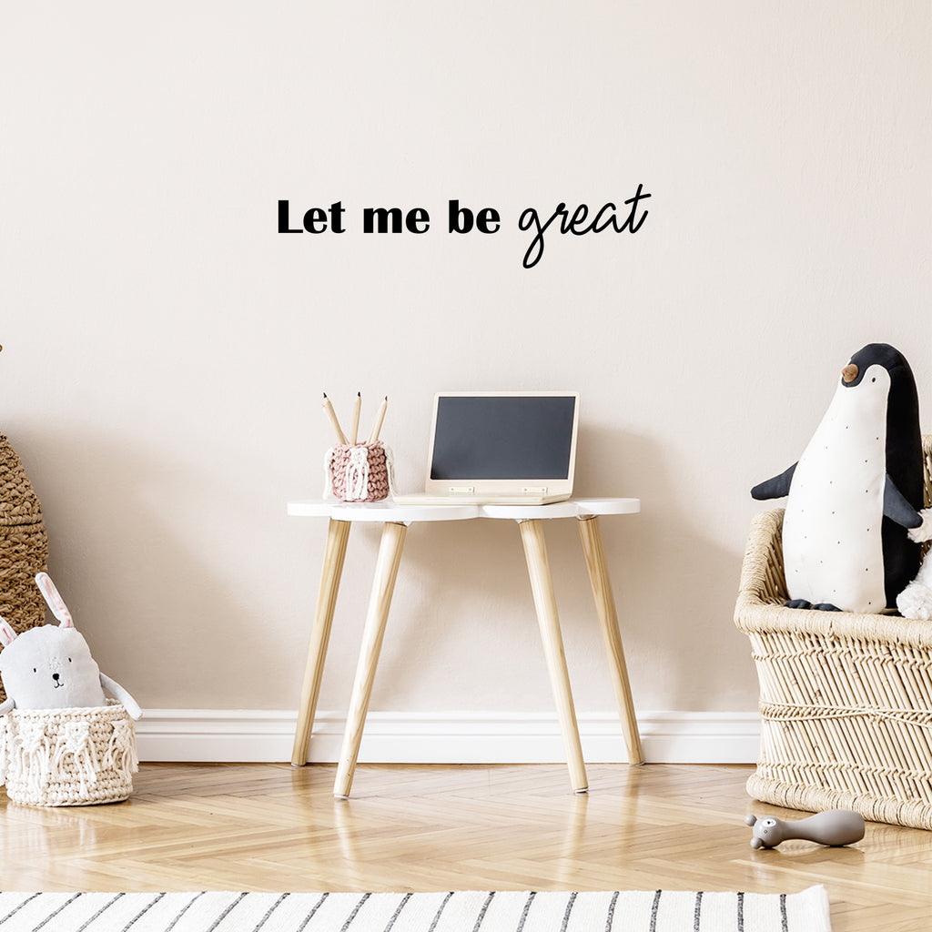 This awesome motivational & optimistic decal quote "Let Me Be Great"; is the perfect touch for your home. Use it for your living room; playroom; kids room or anywhere you want to bring some extra cute decoration. It's a vinyl sticker that is easy to put on any smooth and dry surface. Our modern designs don't just brighten up the room; but brighten up the day. Using top of the line vinyl across all of our production allows us to be the leaders in quality and design.