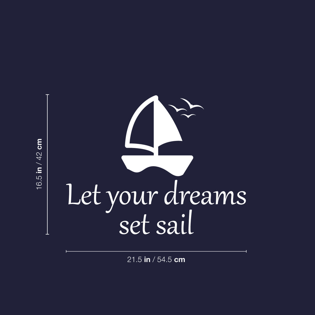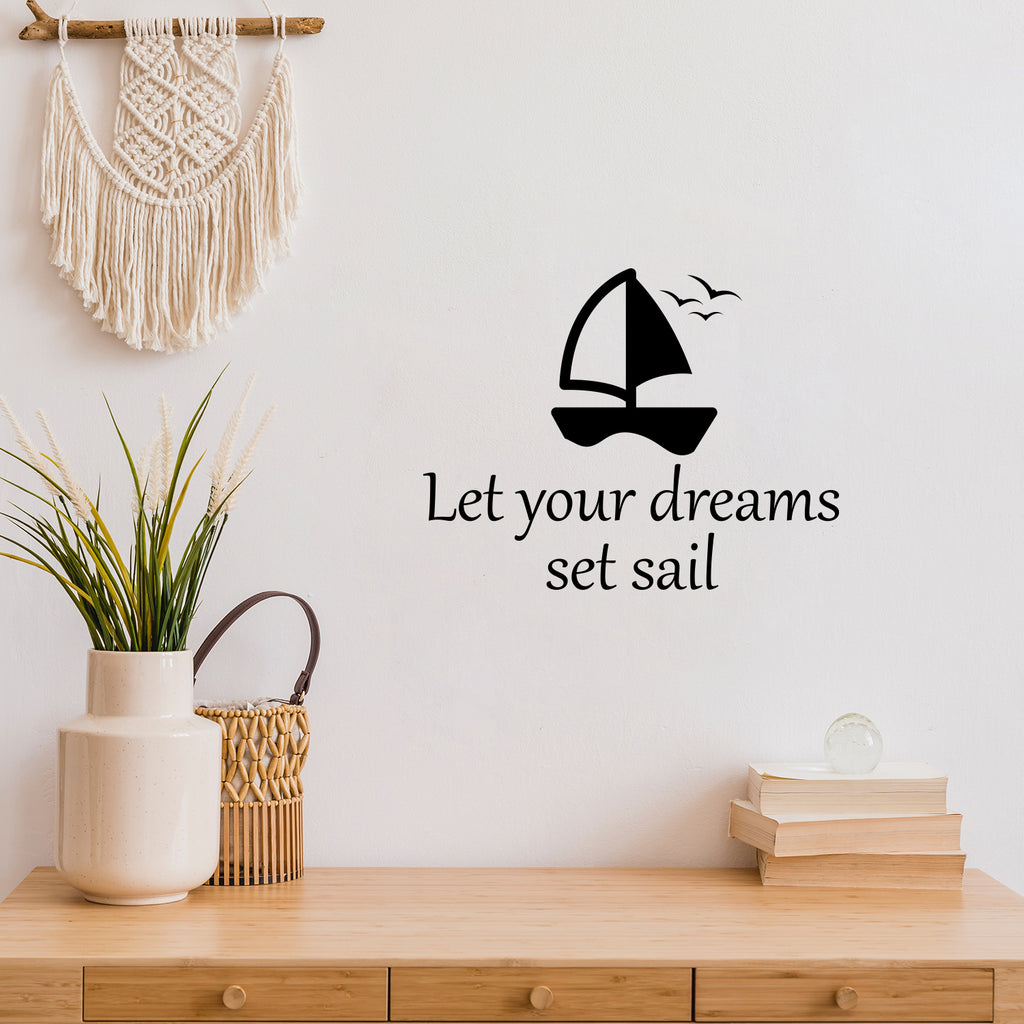 This decal quote "Let Your Dreams Set Sail"; is the perfect touch for your home. Use it for your dorm room or anywhere you want to bring some extra decoration. It's a vinyl sticker that is easy to put on any smooth and dry surface. Our modern designs don't just brighten up the room; but brighten up the day. Using top of the line vinyl across all of our production allows us to be the leaders in quality and design.