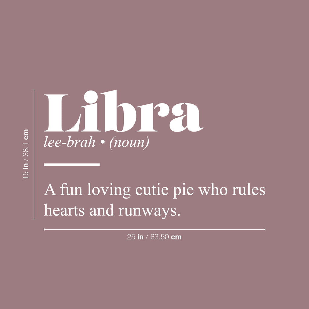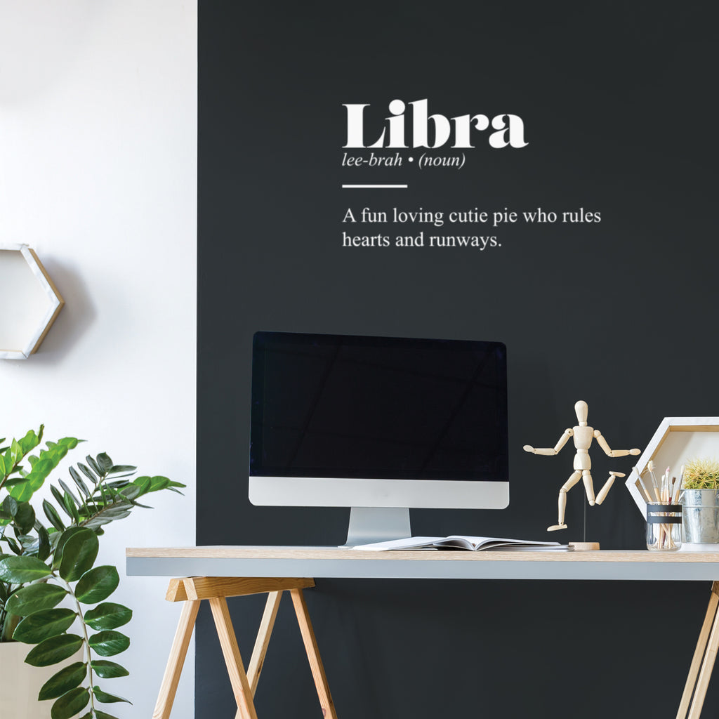 This awesome inspirational decal quote "Libra Zodiac Sign Definition"; is the perfect touch for your home or office. Use it for your bedroom; living room; office or anywhere you want to bring some extra decoration. It's a vinyl sticker that is easy to put on any smooth and dry surface. Our modern designs don't just brighten up the room; but brighten up the day. Using top of the line vinyl across all of our production allows us to be the leaders in quality and design.