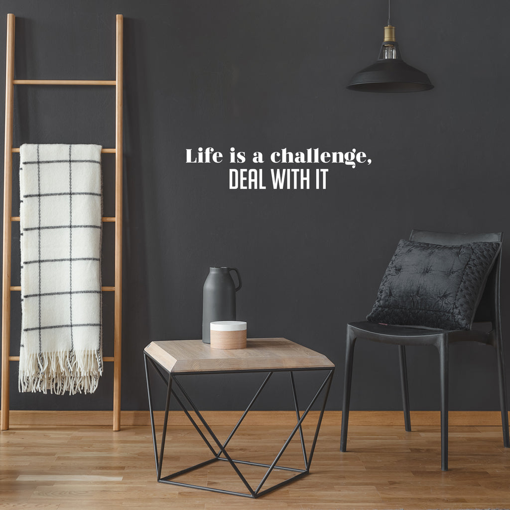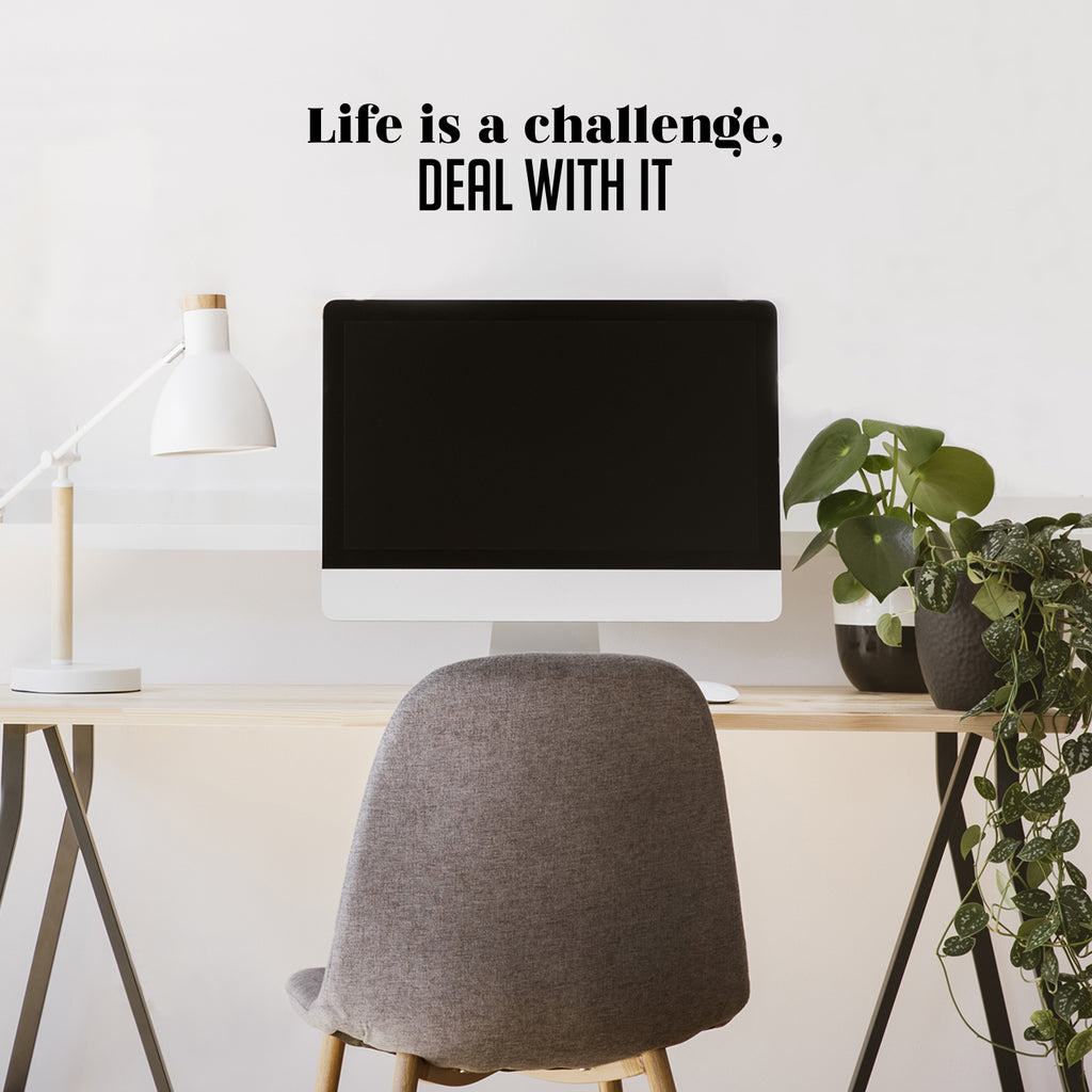 This modern positive & motivational decal quote "Life Is A Challenge; Deal With It"; is the perfect touch for your wellness center or home. Use it for your bedroom; fitness center; office or anywhere you want to bring some extra positive decoration. It's a vinyl sticker that is easy to put on any smooth and dry surface. Our modern designs don't just brighten up the room; but brighten up the day. Using top of the line vinyl across all of our production allows us to be the leaders in quality and design.