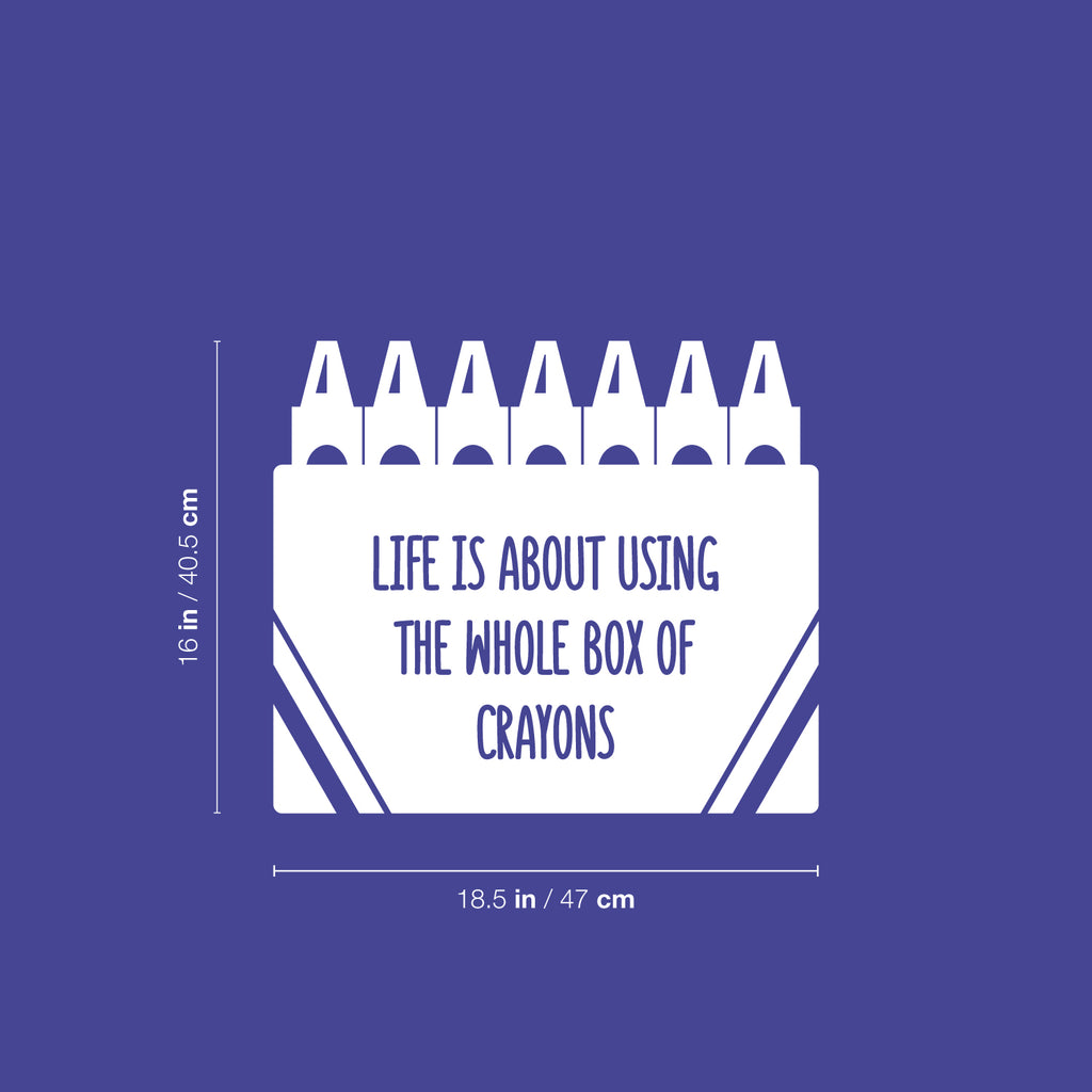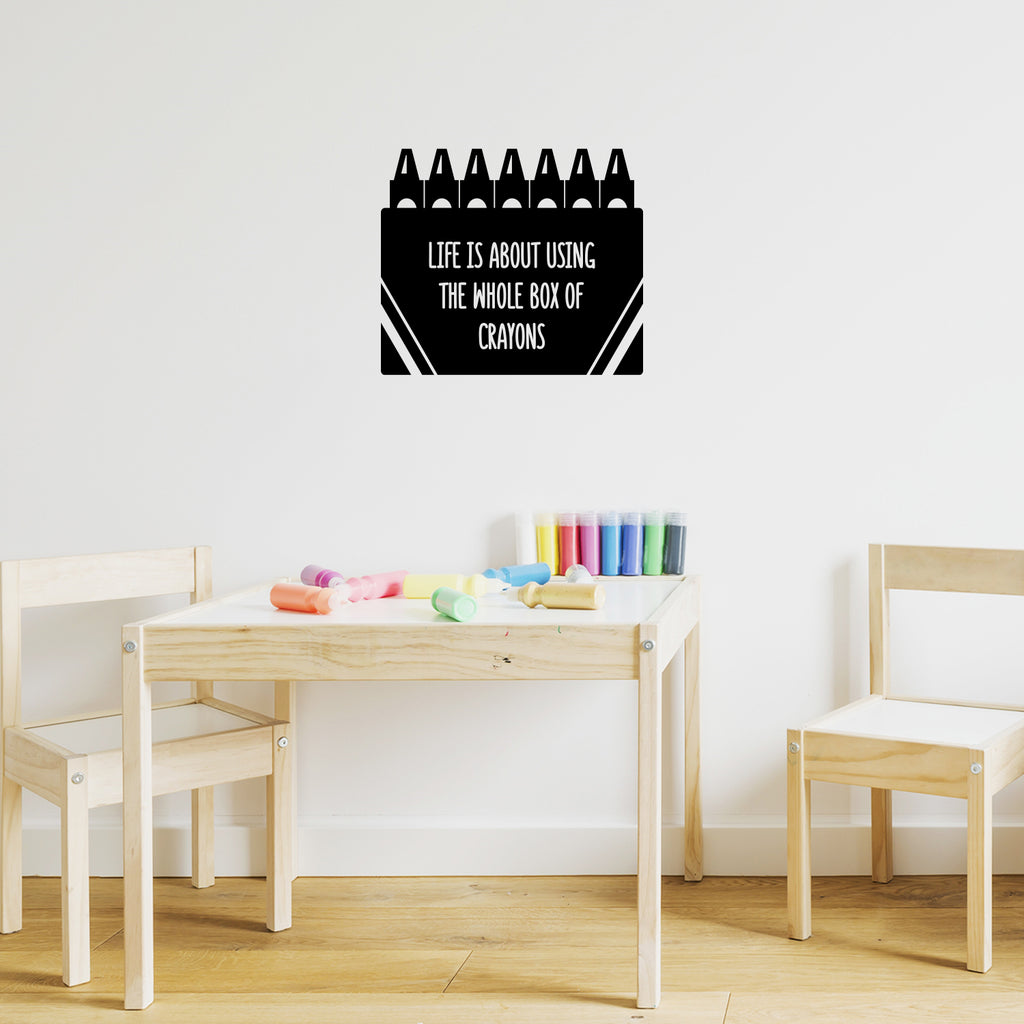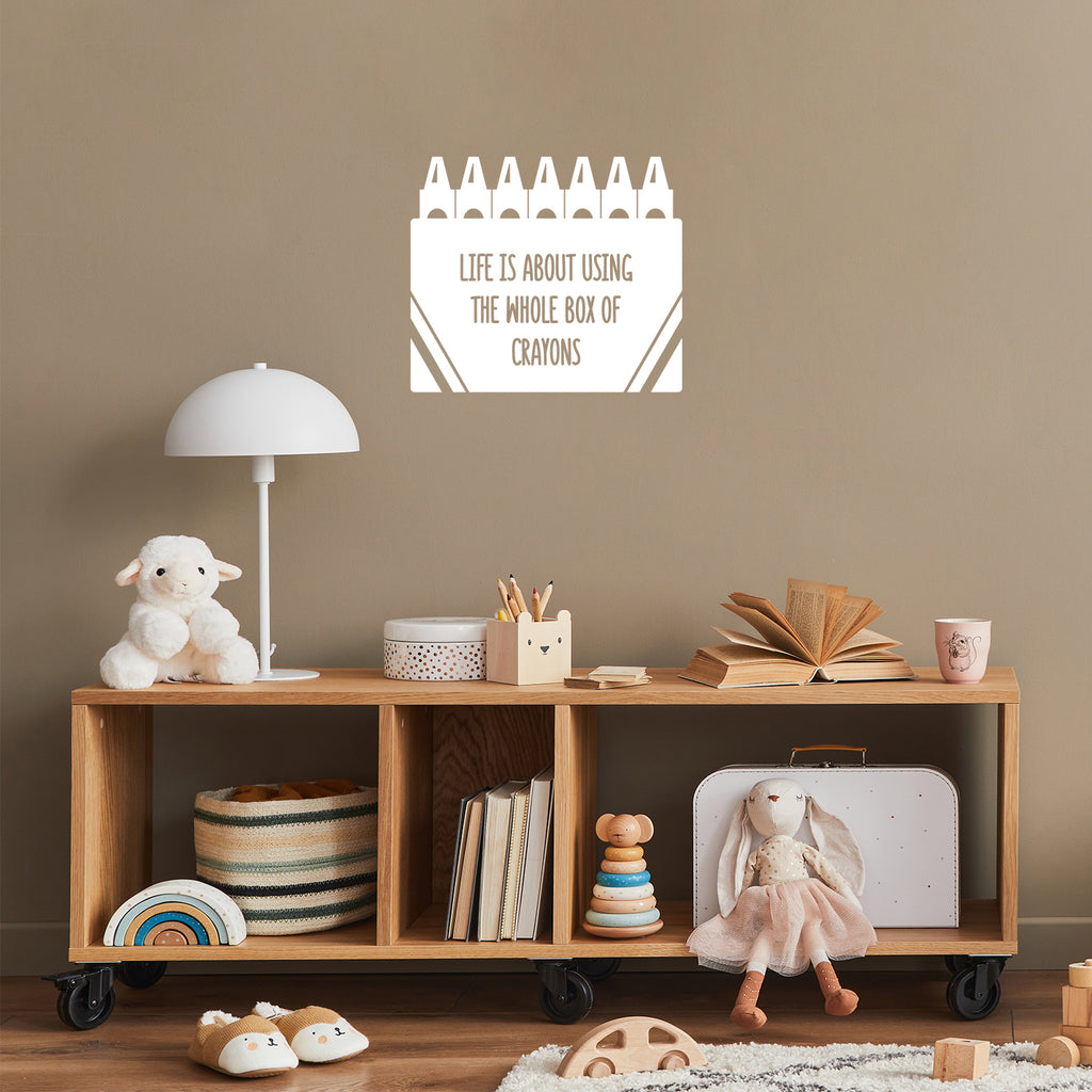 This cute decal quote "Life Is About Using The Whole Box Of Crayons" is the perfect touch for your home. Use it for your nursery; playroom; kids room or anywhere you want to bring some extra cute decoration. It's a vinyl sticker that is easy to put on any smooth and dry surface. Our modern designs don't just brighten up the room; but brighten up the day. Using top of the line vinyl across all of our production allows us to be the leaders in quality and design.