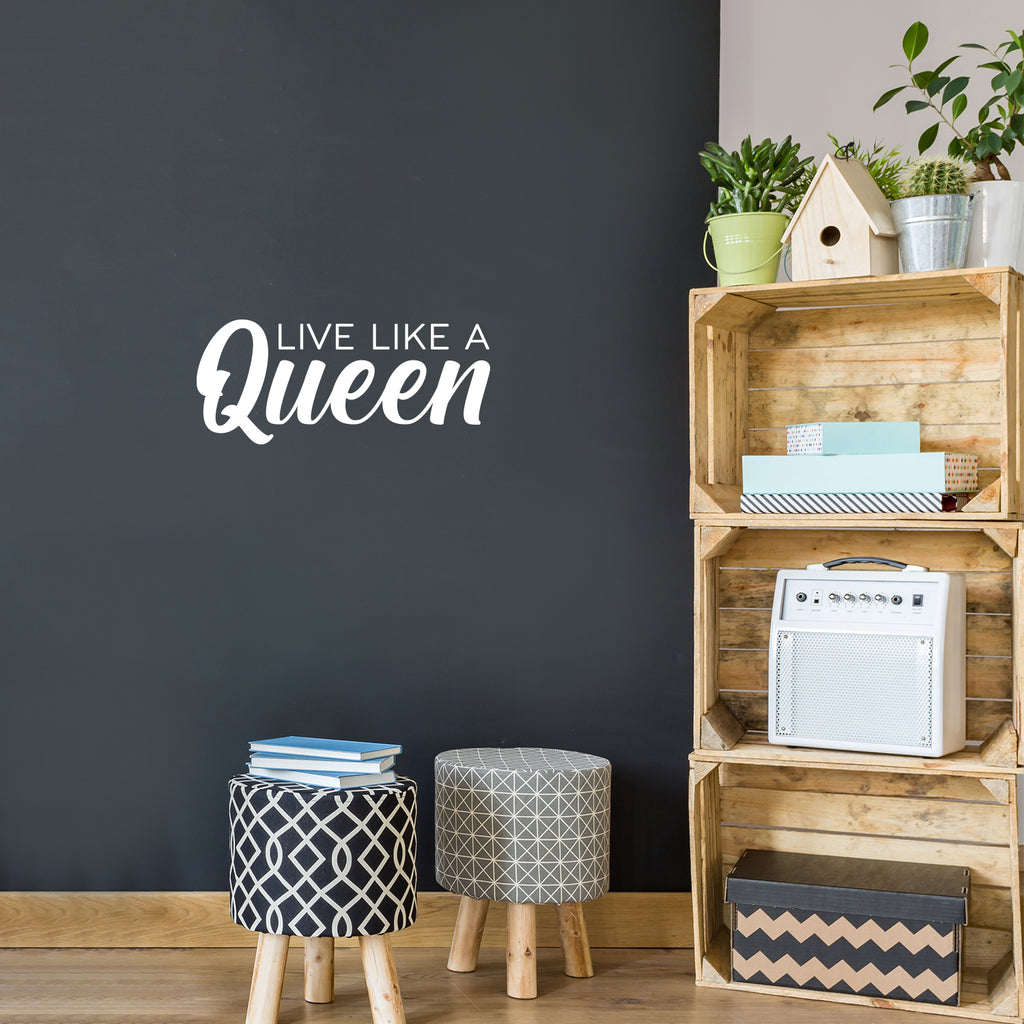 This awesome decal quote "Live Like A Queen"; is the perfect touch for your home or work. Use it for your dorm room; home office or anywhere you want to bring some extra decoration. It's a vinyl sticker that is easy to put on any smooth and dry surface. Our modern designs don't just brighten up the room; but brighten up the day. Using top of the line vinyl across all of our production allows us to be the leaders in quality and design.