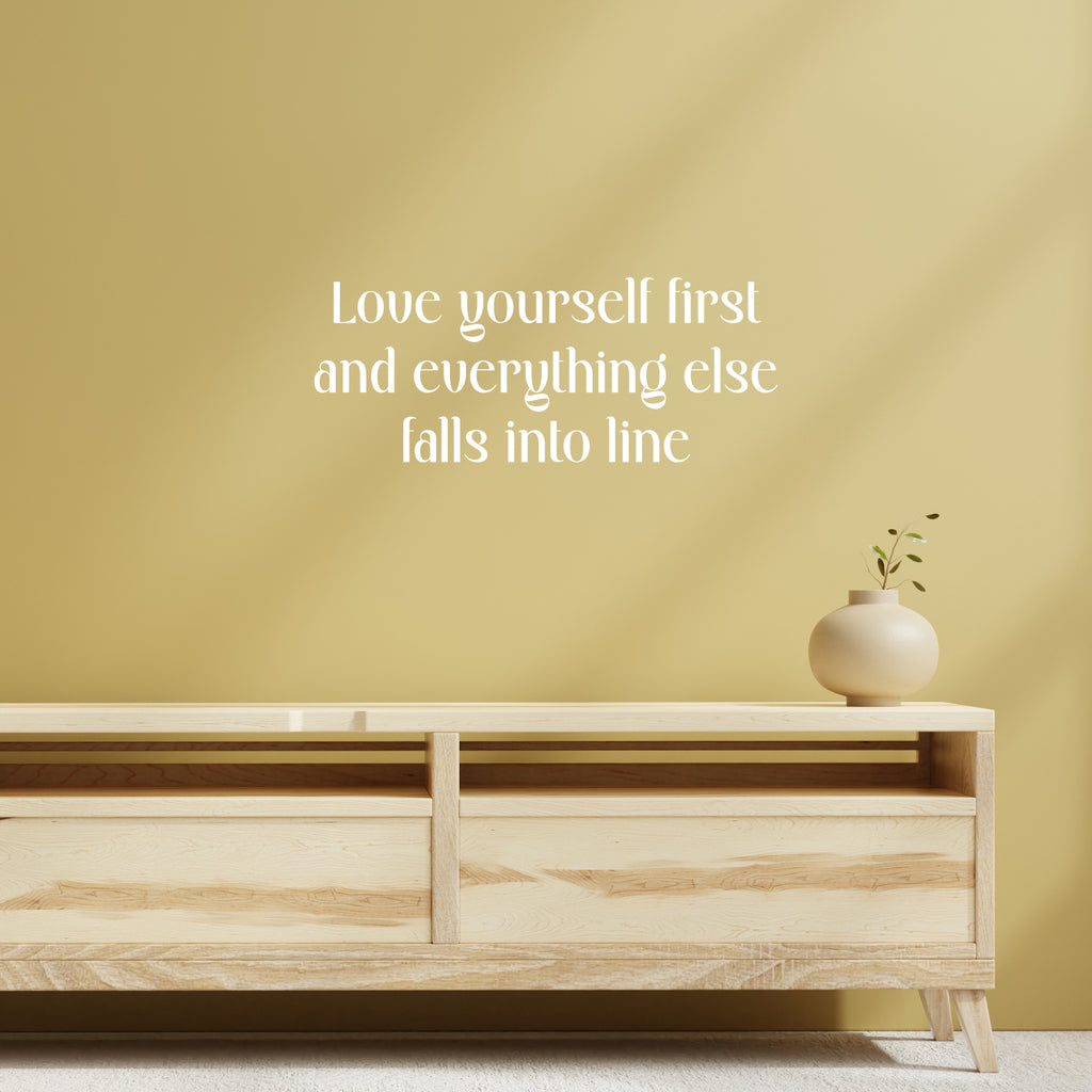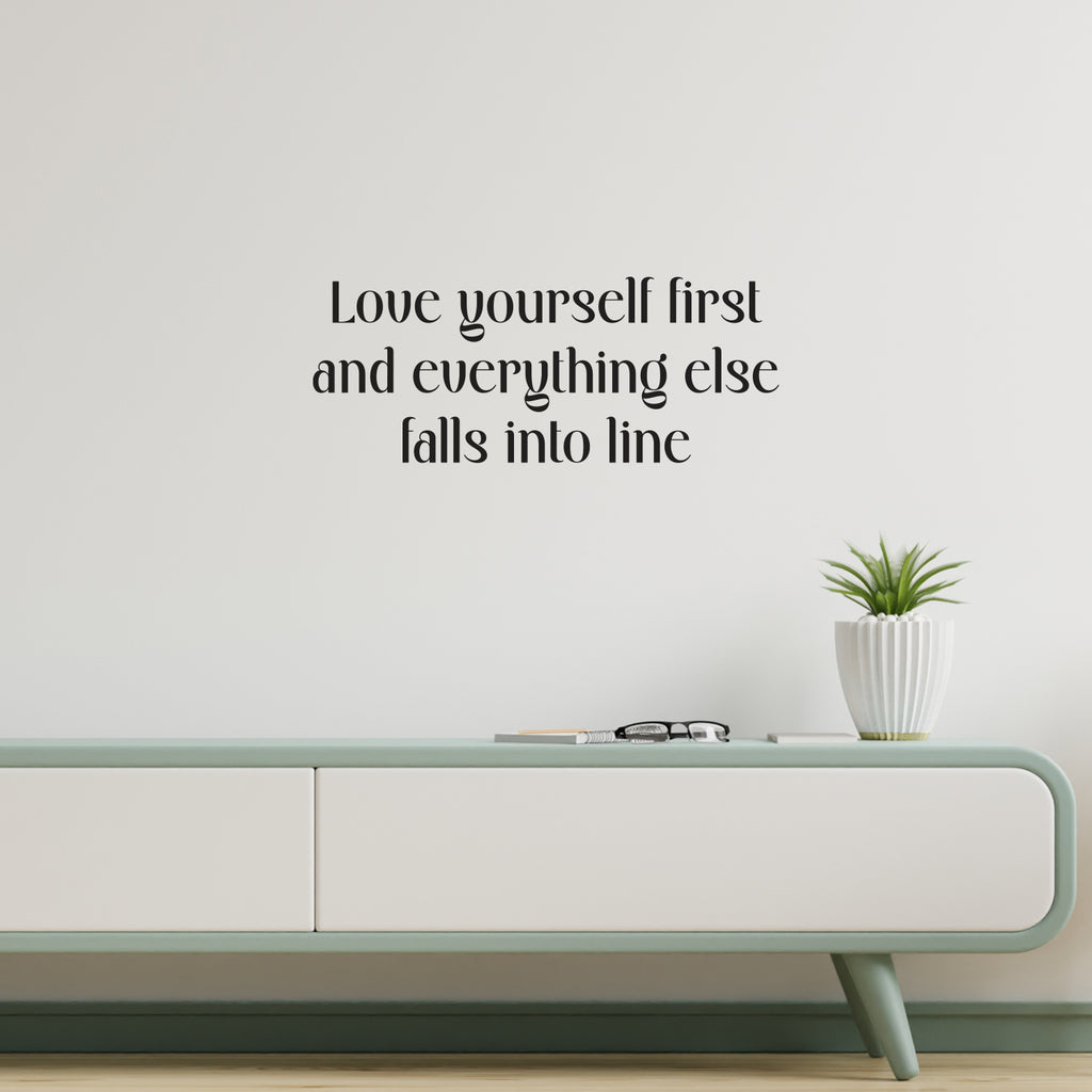 This decal quote "Love Yourself First And Everything Else Falls Into Line"; is the perfect touch for your home. Use it for your dorm room or anywhere you want to bring some extra decoration. It's a vinyl sticker that is easy to put on any smooth and dry surface. Our modern designs don't just brighten up the room; but brighten up the day. Using top of the line vinyl across all of our production allows us to be the leaders in quality and design.