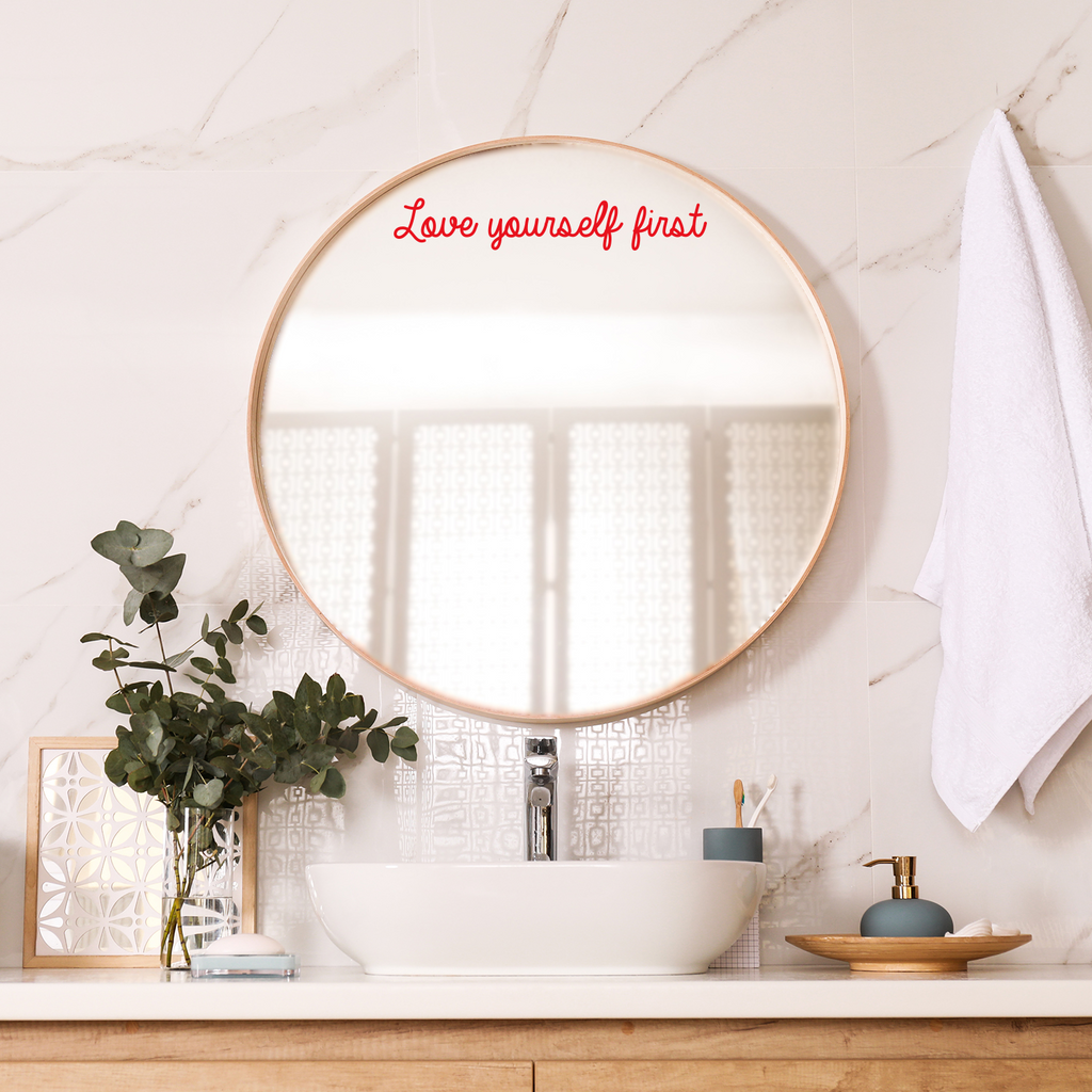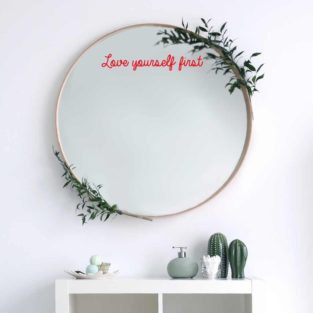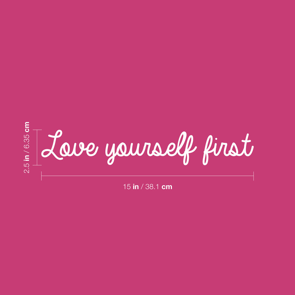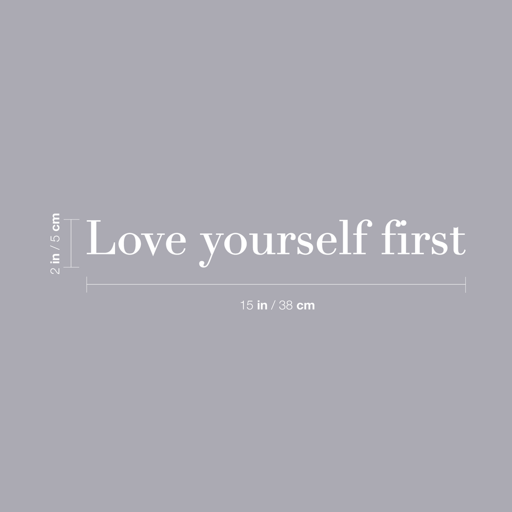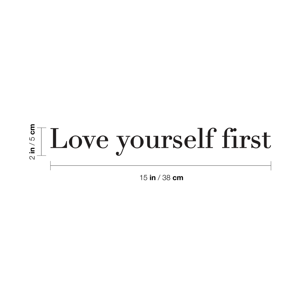 This cute & inspirational decal quote "Love Yourself First"; is the perfect touch for your school or office. Use it for your living room; bathroom; business or anywhere you want to bring some extra positive decoration. It's a vinyl sticker that is easy to put on any smooth and dry surface. Our modern designs don't just brighten up the room; but brighten up the day. Using top of the line vinyl across all of our production allows us to be the leaders in quality and design.