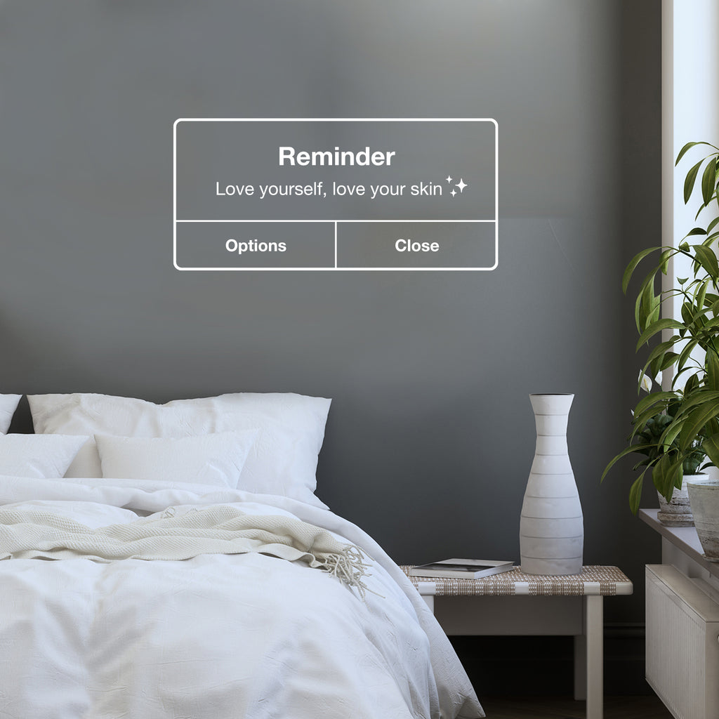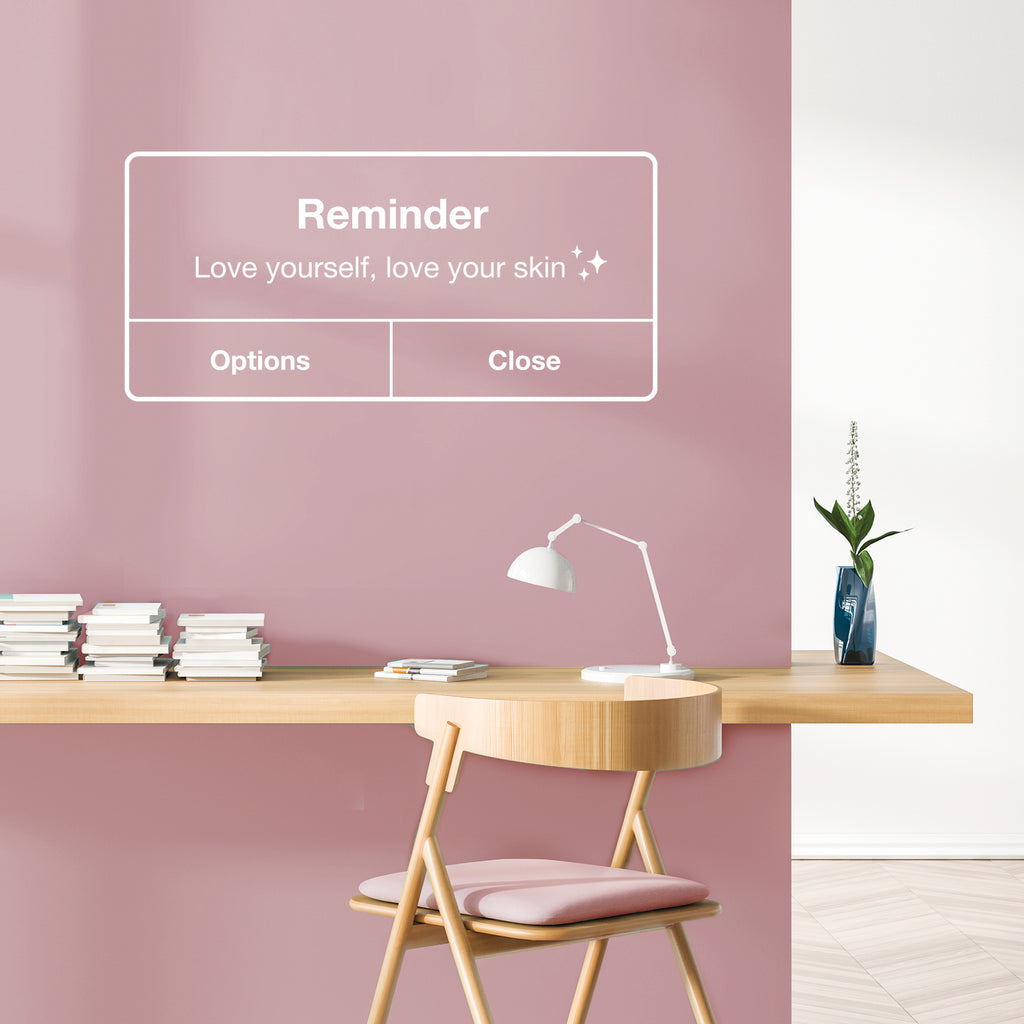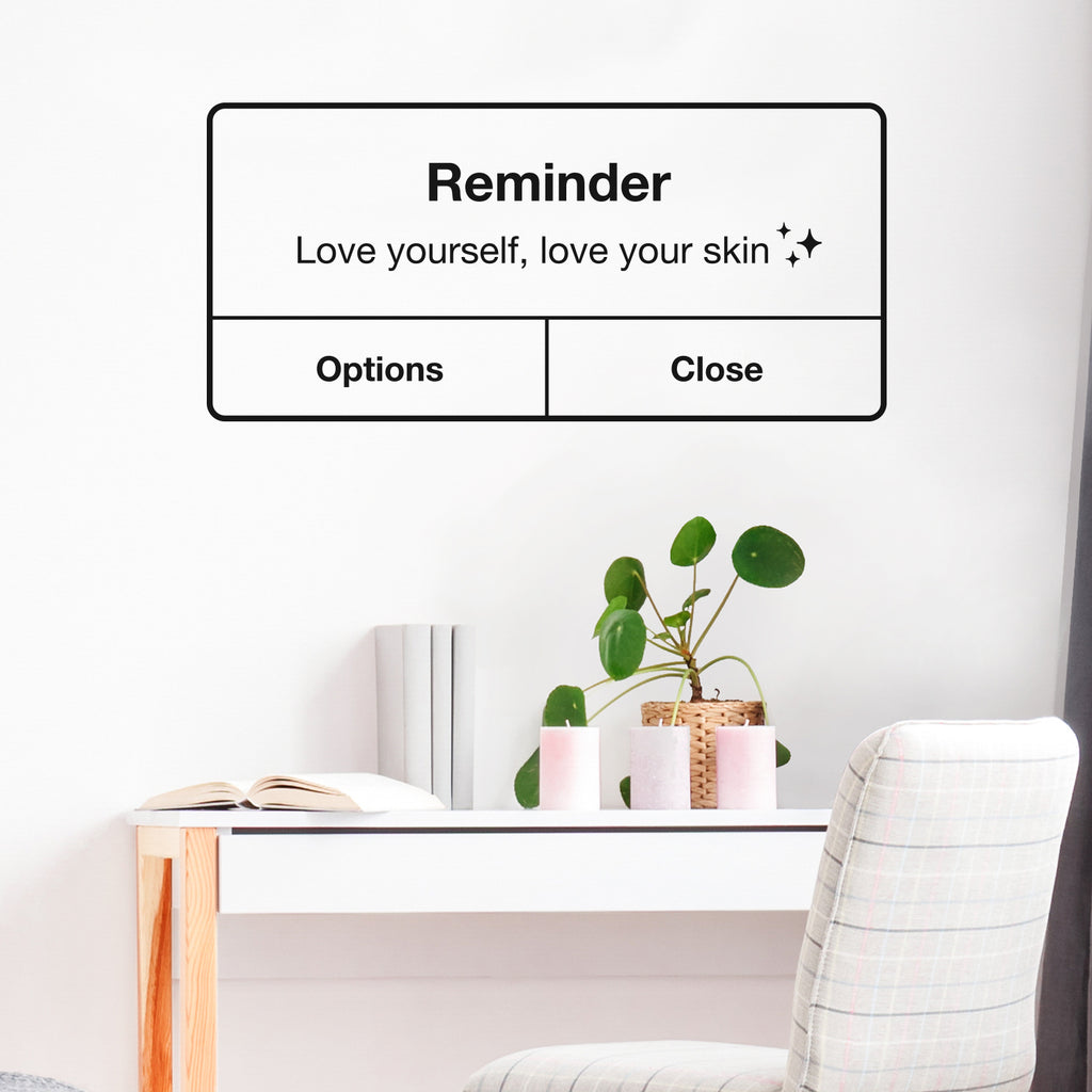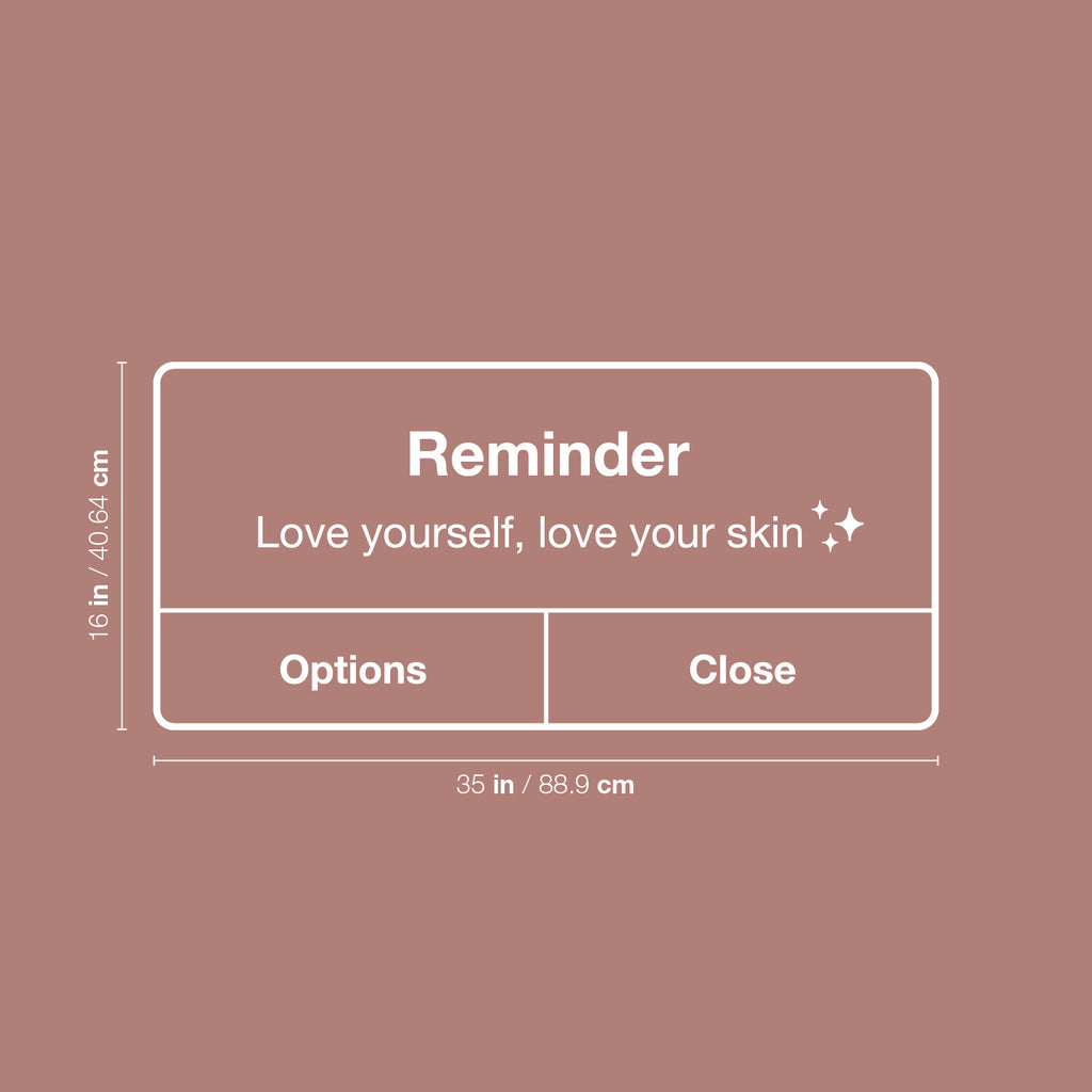 This great decal quote "Reminder: Love Yourself; Love Your Skin"; is the perfect touch for your home. Use it for your dorm room; living room or anywhere you want to bring some extra decoration. It's a vinyl sticker that is easy to put on any smooth and dry surface. Our modern designs don't just brighten up the room; but brighten up the day. Using top of the line vinyl across all of our production allows us to be the leaders in quality and design.