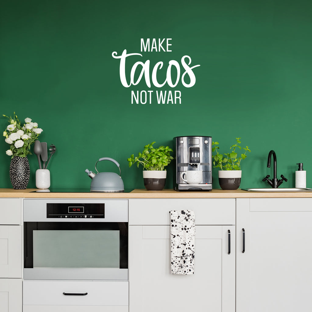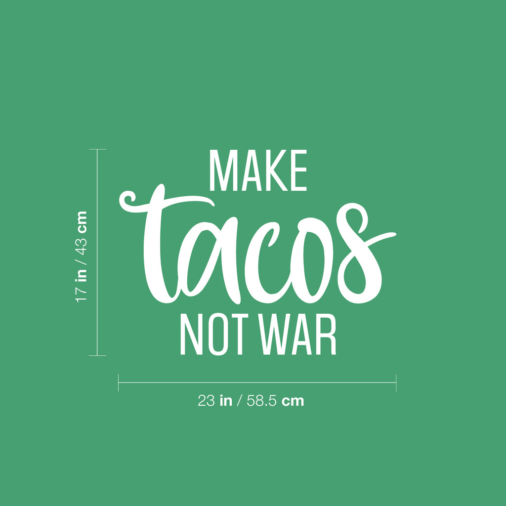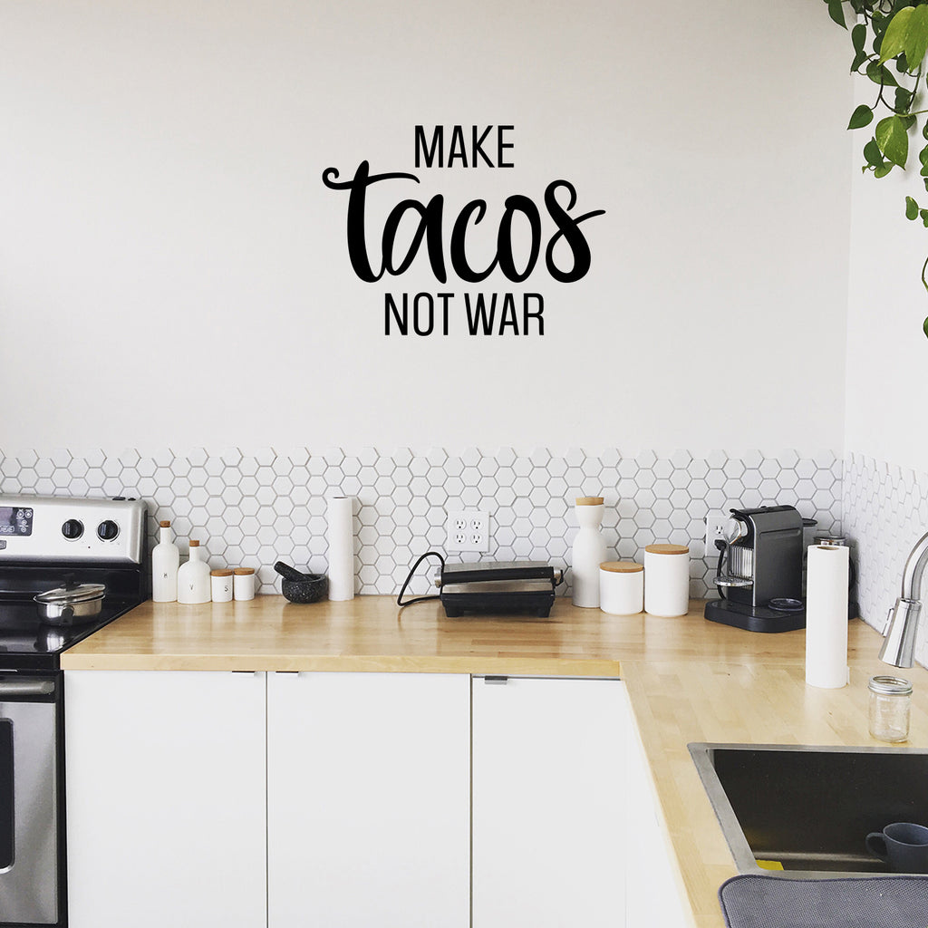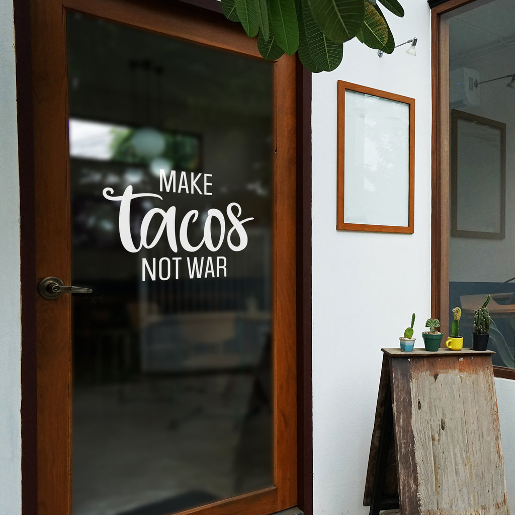 This awesome cute & fun decal quote "Make Tacos Not War"; is the perfect touch for your kitchen or shopfront. Use it for your dining room; restaurant; kitchen or anywhere you want to bring some extra fun decoration. It's a vinyl sticker that is easy to put on any smooth and dry surface. Our modern designs don't just brighten up the room; but brighten up the day. Using top of the line vinyl across all of our production allows us to be the leaders in quality and design.