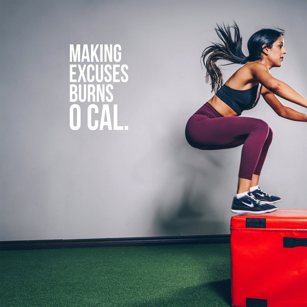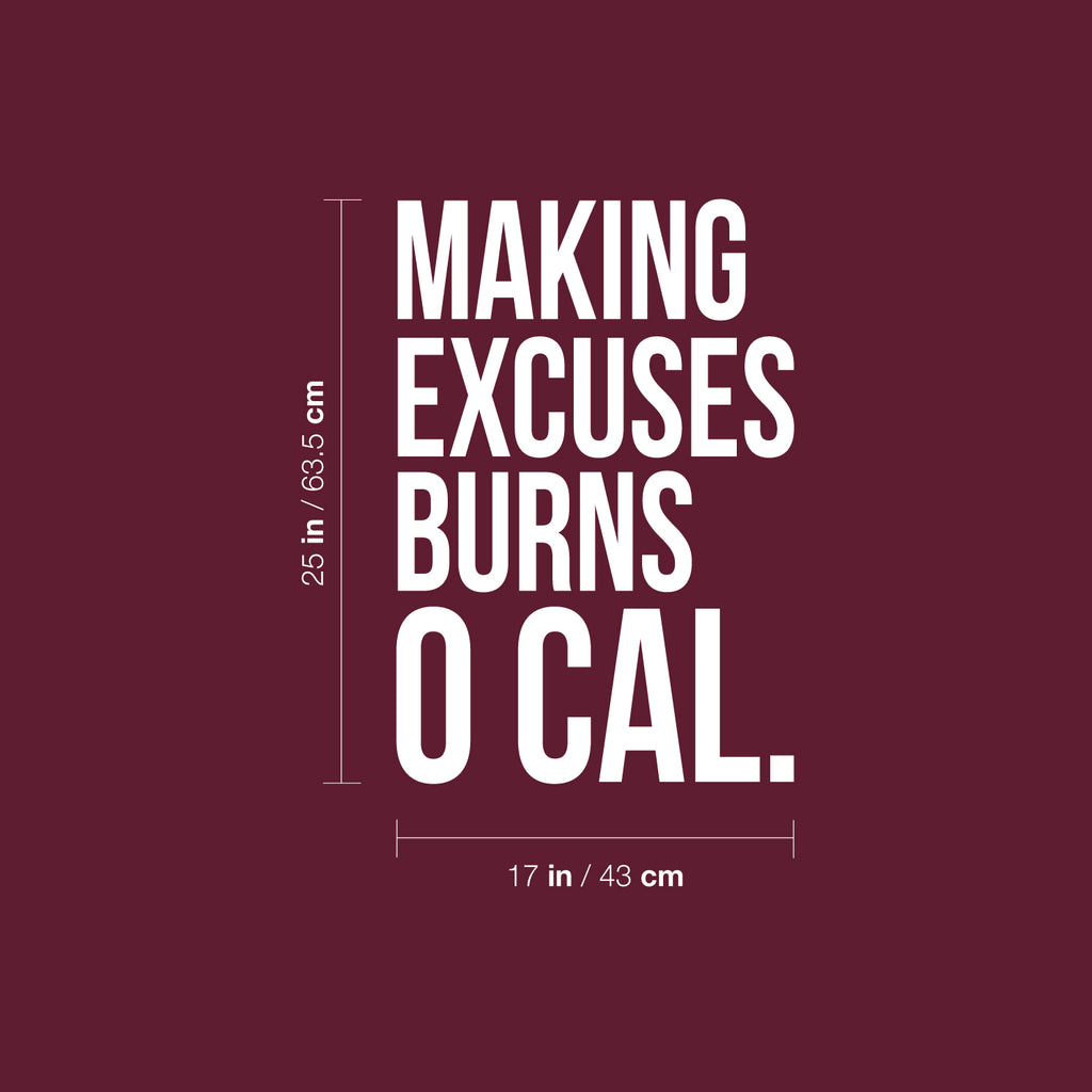 This awesome positive motivational decal quote "Making Excuses Burns 0 Cal."; is the perfect touch for your home or office. Use it for your workout room; fitness center; storefront or anywhere you want to bring some extra motivational decoration. It's a vinyl sticker that is easy to put on any smooth and dry surface. Our modern designs don't just brighten up the room; but brighten up the day. Using top of the line vinyl across all of our production allows us to be the leaders in quality and design.